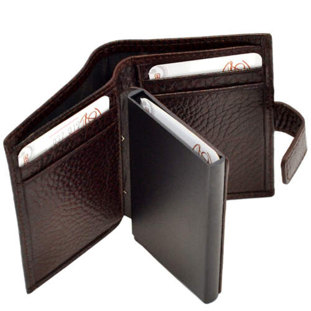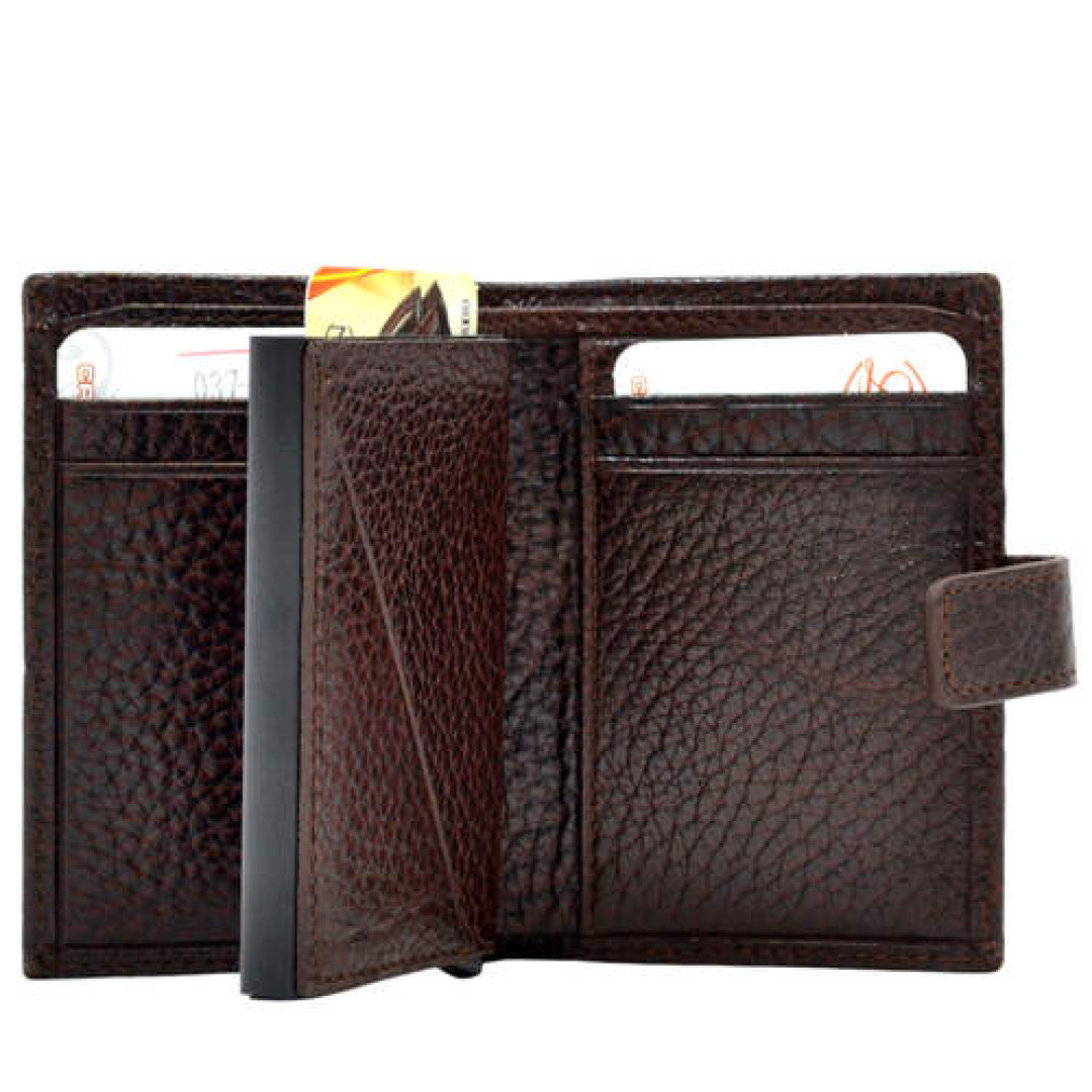 Особенности: внутри 1 отделение для купюр, 4 выемки для карточек и отсек с выдвижным механизмом для своих визиток. Закрывается на хлястик с кнопкой.