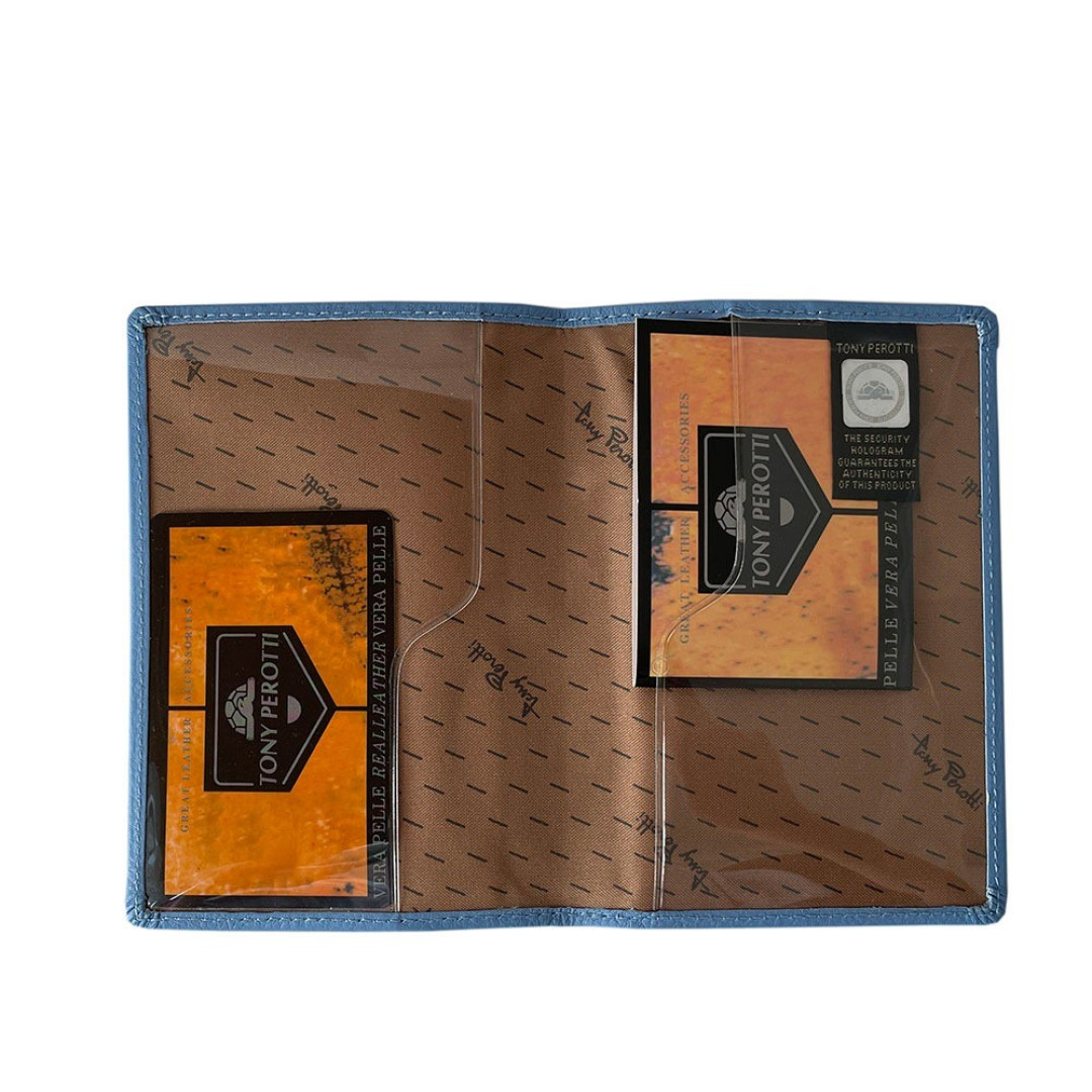 Обложка для документов TONY PEROTTI выполнена из высококачественной кожи телёнка, лицевой слой в голубом цвете.