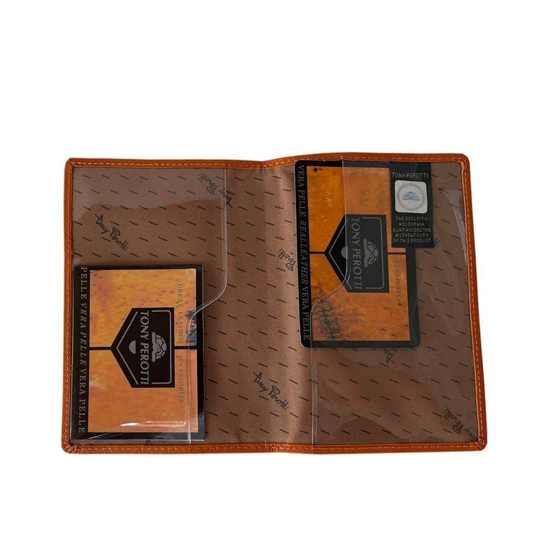 Обложка для документов TONY PEROTTI выполнена из высококачественной кожи телёнка, лицевой слой в оранжевом цвете.
