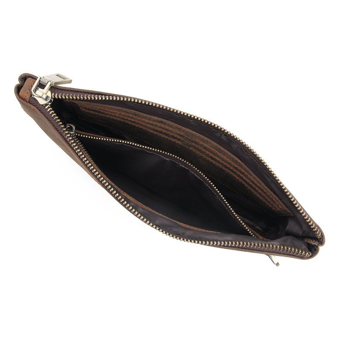 Особенности: имеет одно вместительное отделение на молнии, внутри два горизонтальных кармана, 6 отсеков для кредитных карт. В комплекте кистевой ремень.
