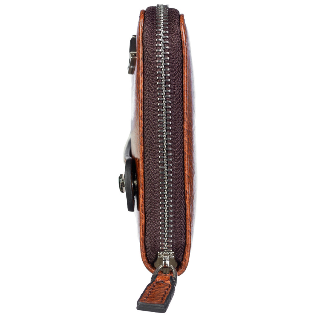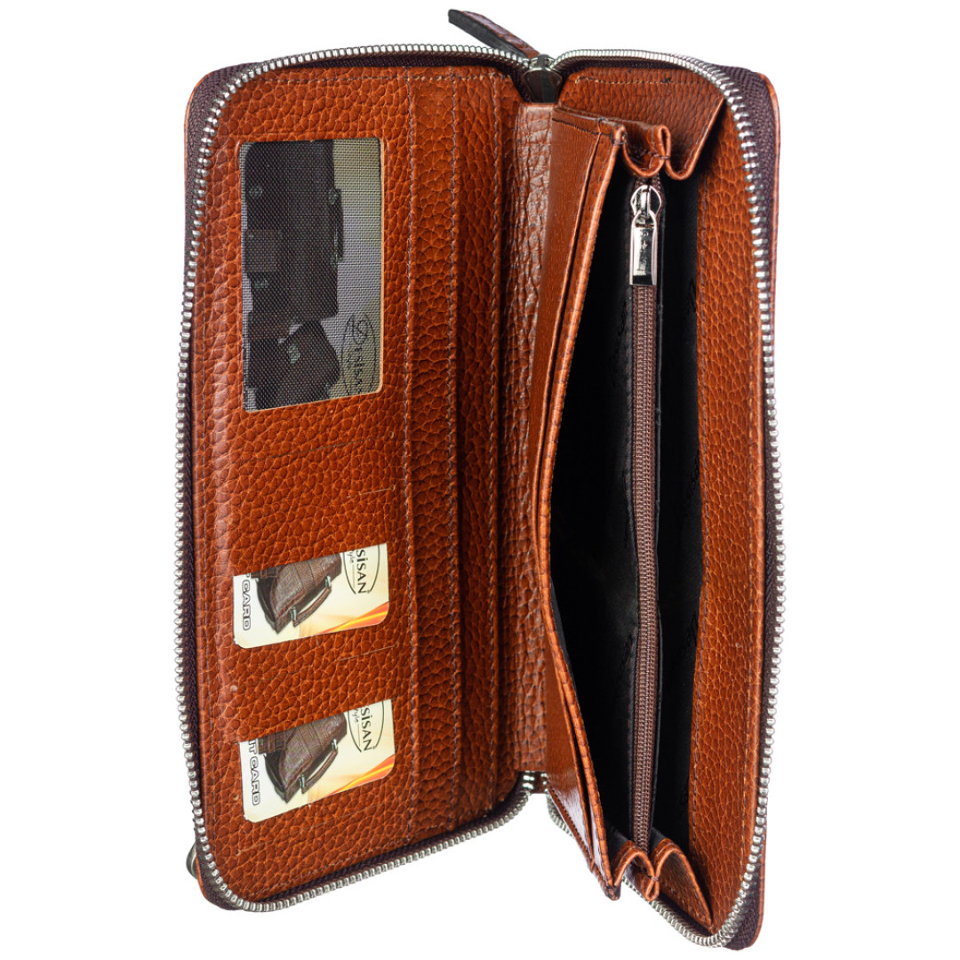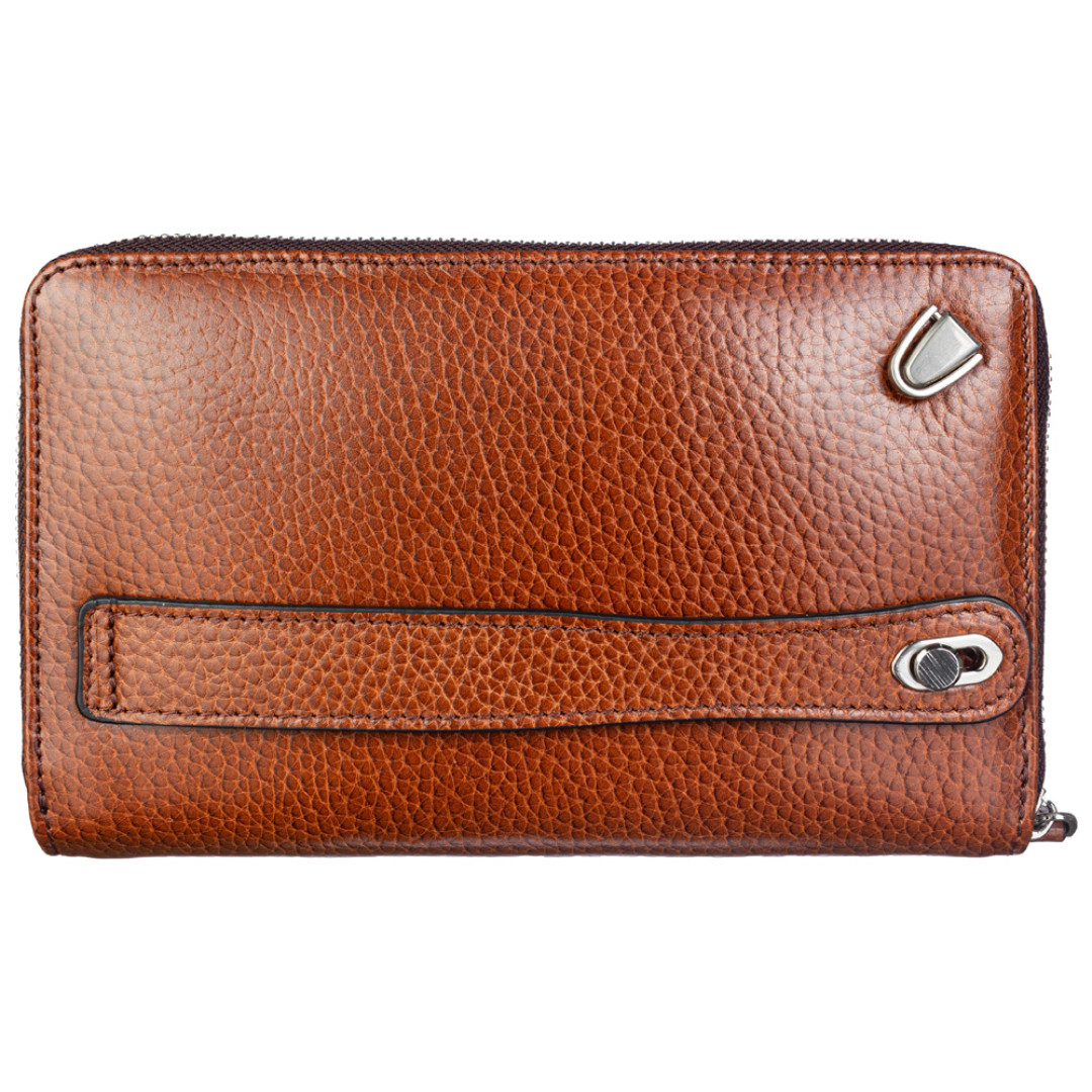 Особенности: внутри аксессуара: 1 основное отделение, закрывающееся на молнию, 2 отделения для банкнот, 1 карман-перегородка на молнии (монетница), 8 ячеек для банковских карт, 4 горизонтальных кармана. На тыльной стороне: ремень-держатель для ладони.