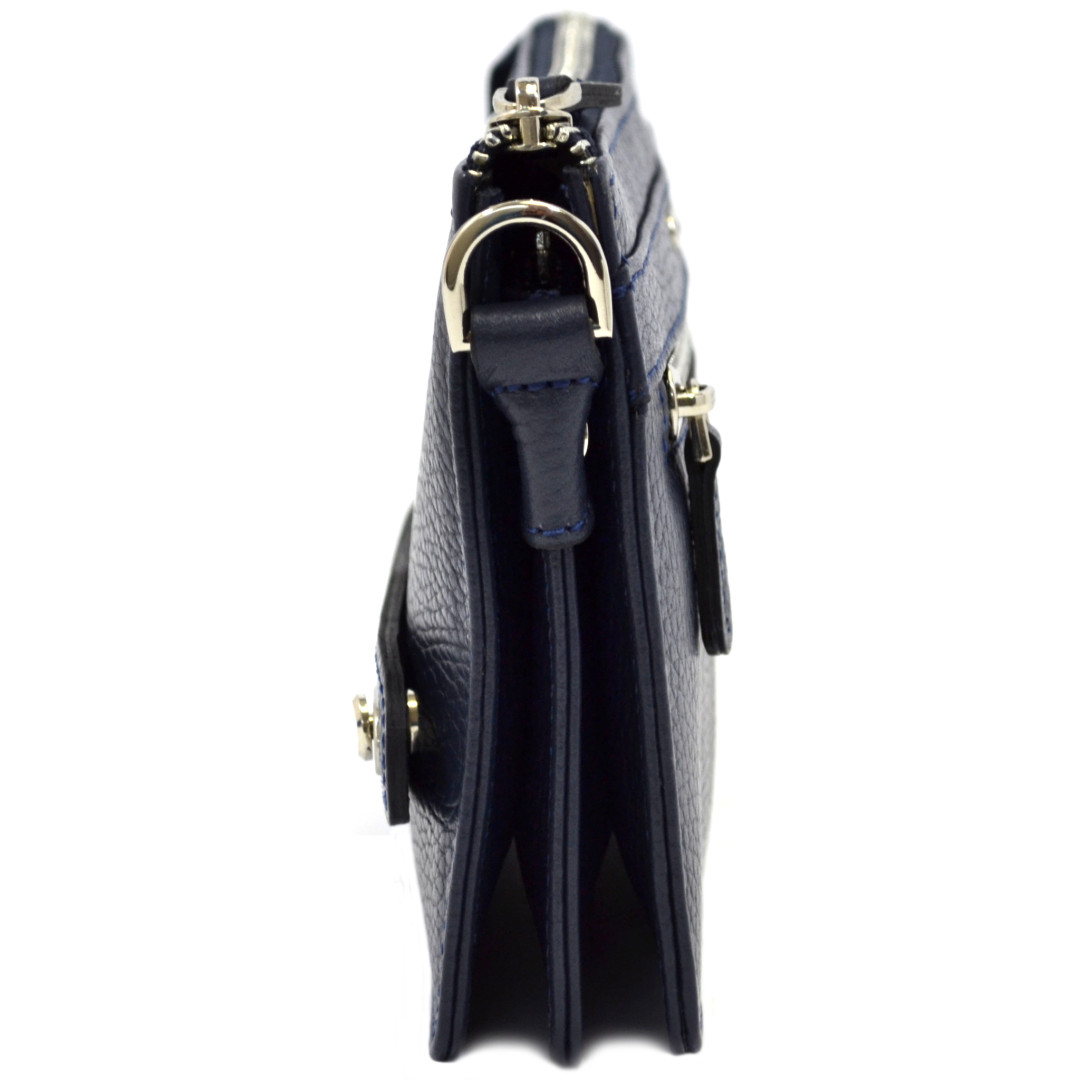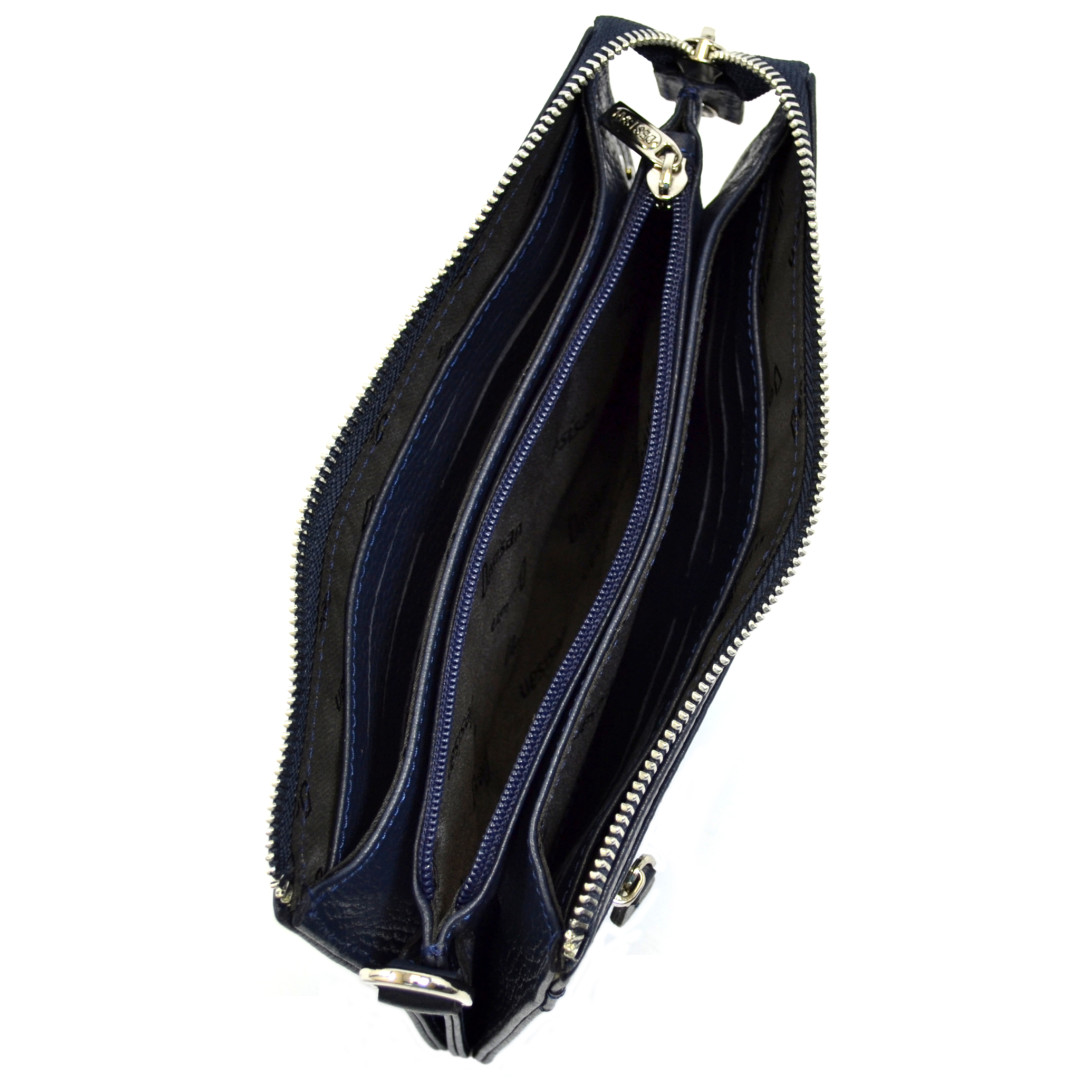 Особенности: имеет 2 отдела для купюр, разделенных перегородкой на змейке, 12 кармашков для карт и кистевой ремешок. Спереди - отсек на змейке, а сзади - держатель для ладони.