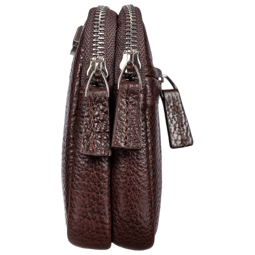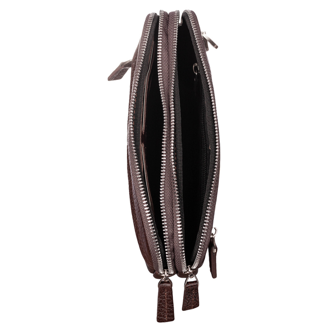 Особенности: включает в себя 2 отдела и кистевой ремешок. В первом отделе имеется 4 ячейки для карт и открытый кармашек, а во втором вшит отсек на молнии.