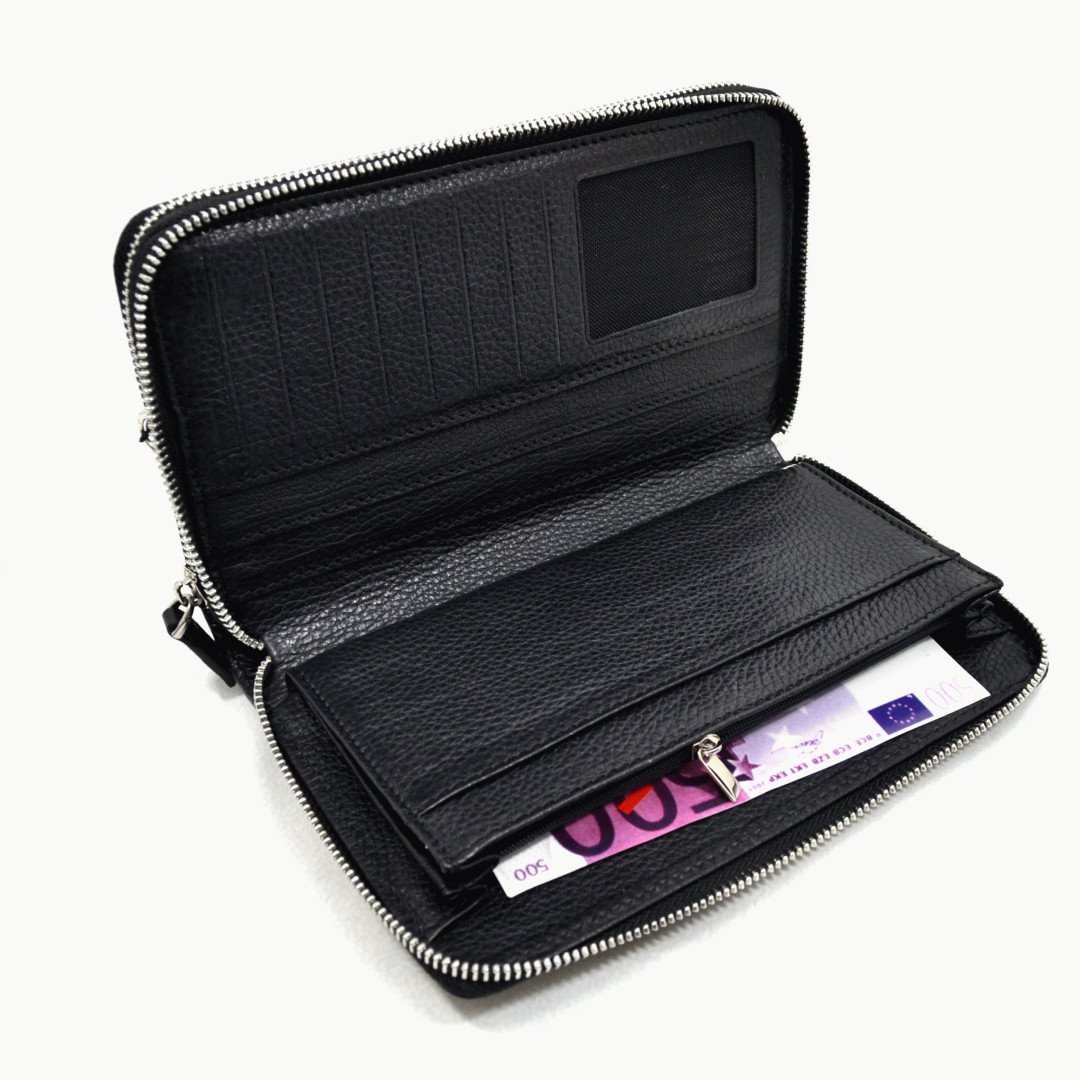 Особенности: имеет 2 отделения на молнии, 4 открытых кармана, 8 отсеков для кредитных карт, 2 кармана для купюр с разделителем-монетницей.