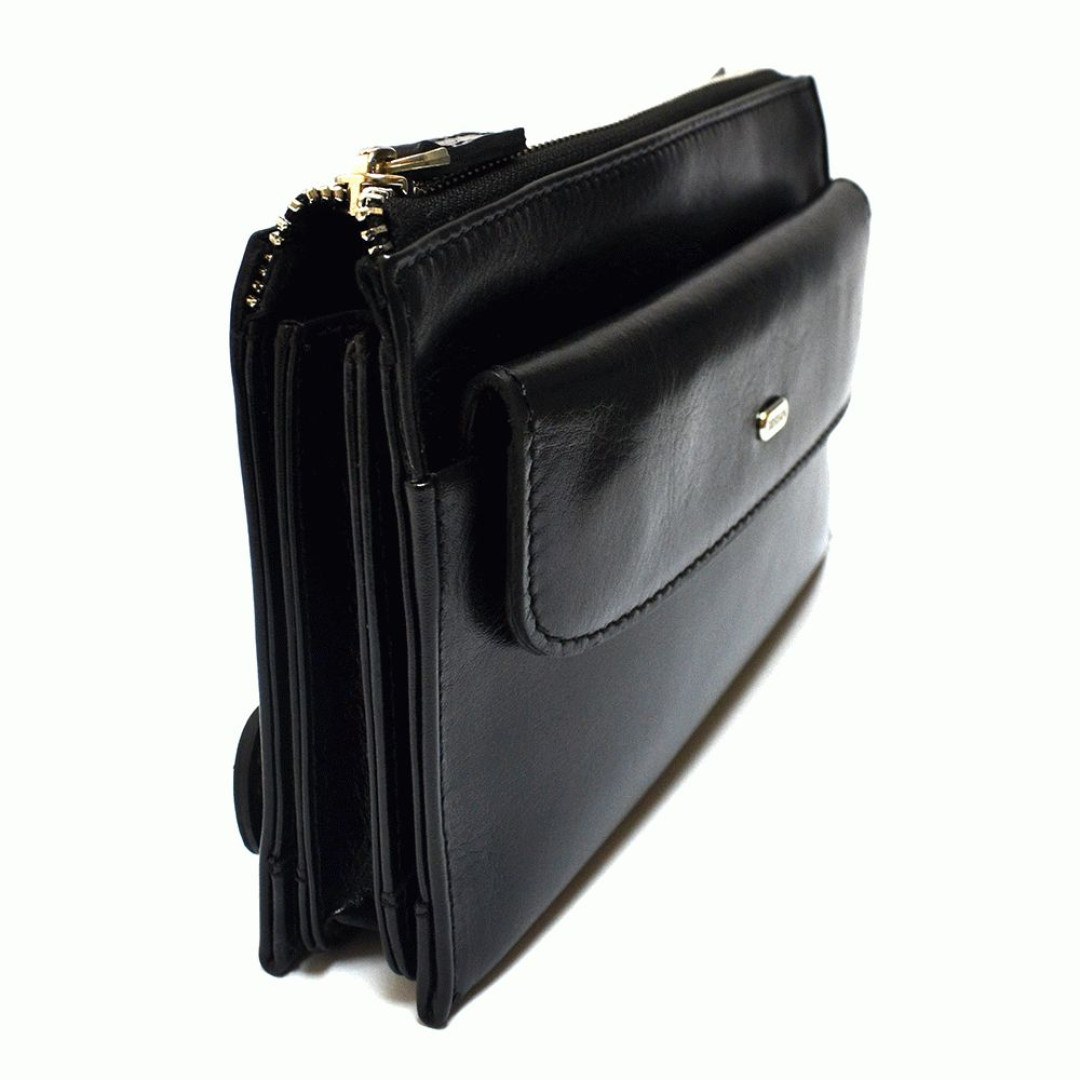 Особенности: включает в себя  3 основных отделения для купюр, которые разделены перегородками. На лицевой стороне – выдвижной карман  с отделением для купюр и 6 кармашками для пластиковых карт. На тыльной стороне - держатель для ладони.