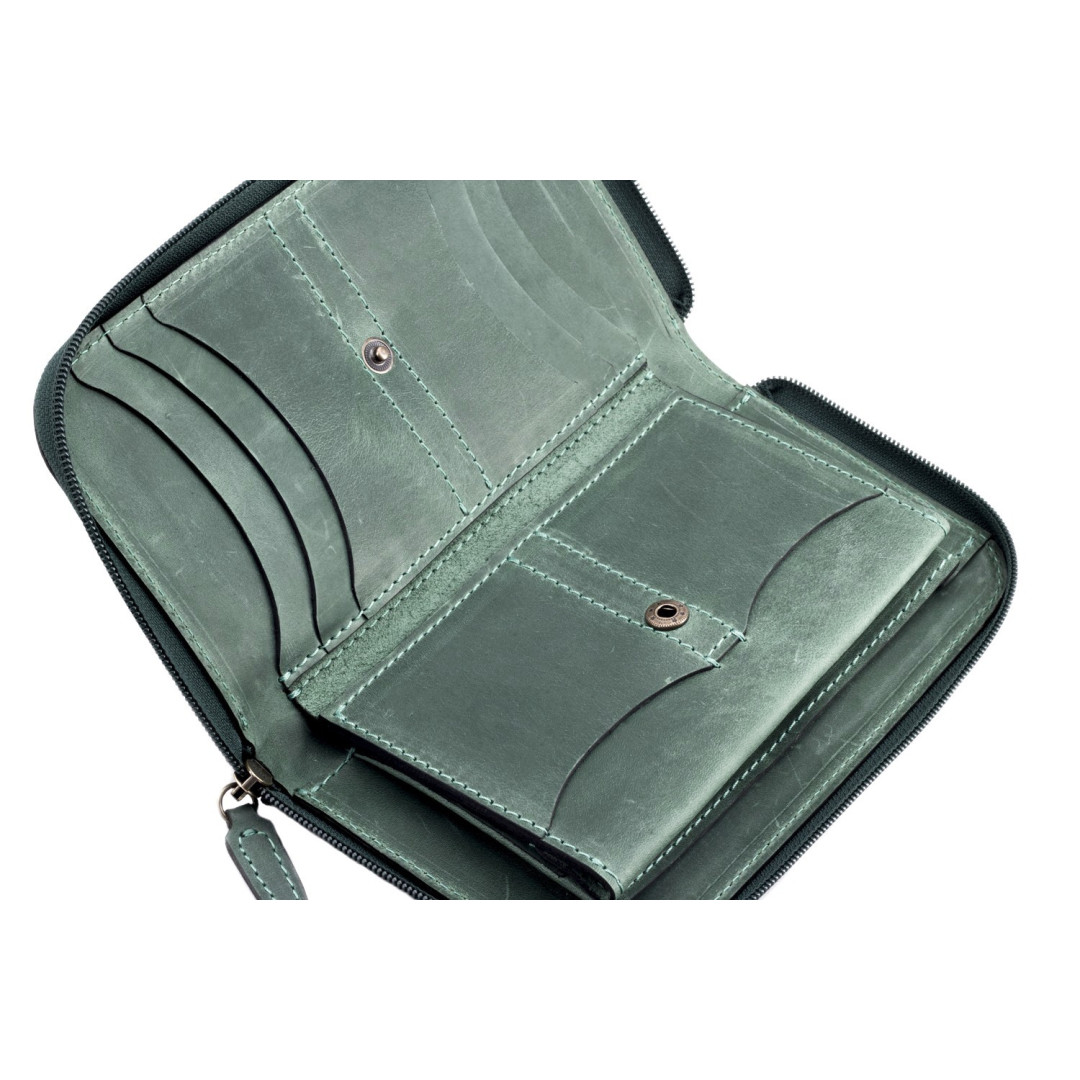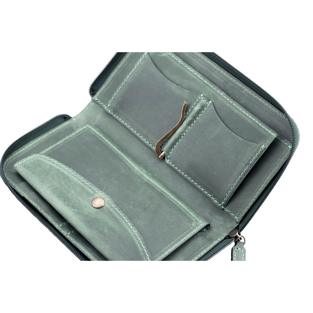 Клатч ручной работы на молнии. Состоит из нескольких внутренних отделений: одно большое, которое сможет поместить в себя всё самое ценное, десять для карт и визиток, зажим для купюр, и карман для мелочи на кнопке.