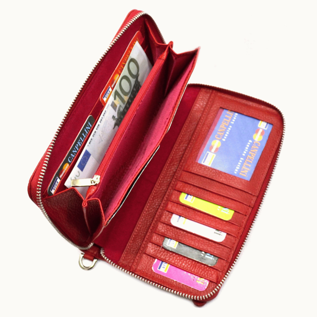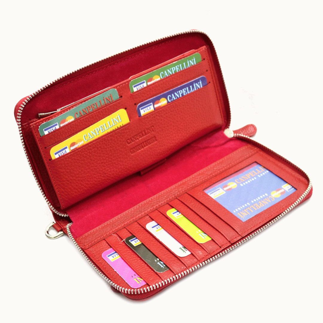 Особенности: основное отделение на металлической молнии, внутри множество карманов для карточек, документов и денег. На тыльной стороне - отсек на змейке. В комплекте съемный ремешок для ношения аксессуара на запястье.