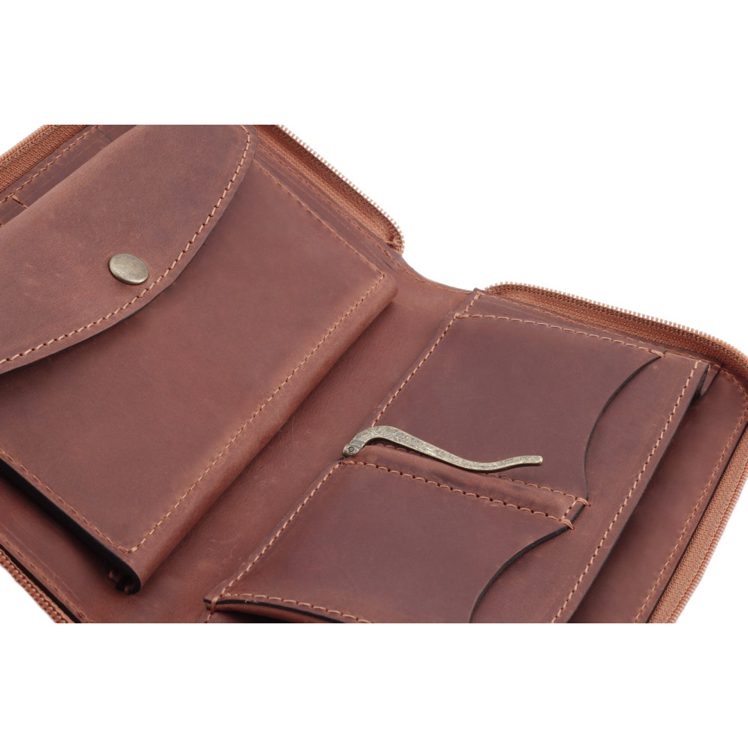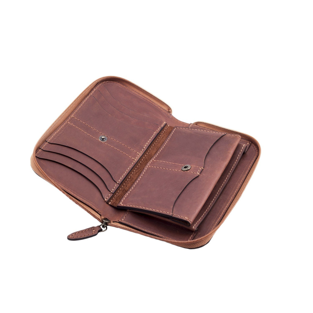Кошелек ручной работы на молнии. Состоит из нескольких внутренних отделений: одно большое, которое сможет поместить в себя всё самое ценное, десять для карт и визиток, зажим для купюр, и карман для мелочи на кнопке.