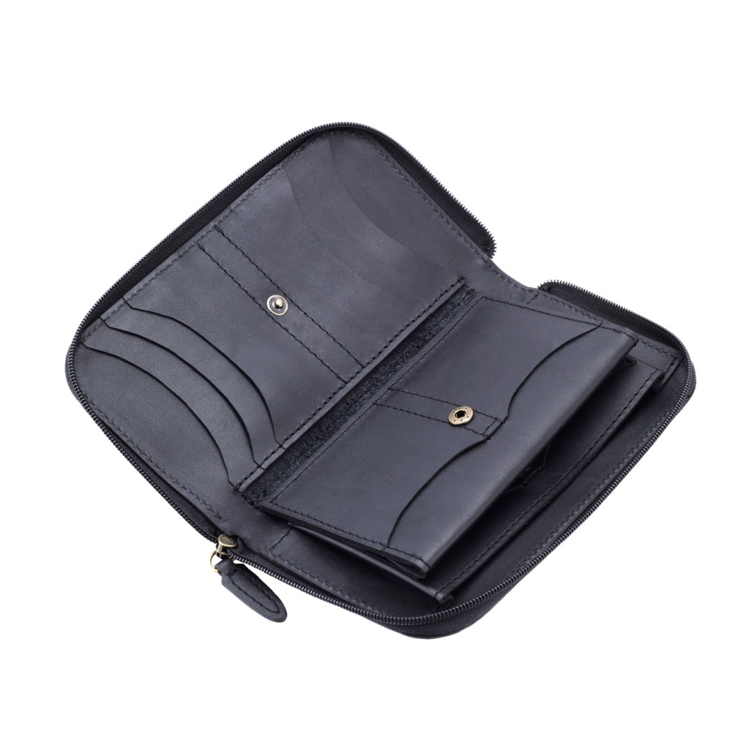 Кошелек ручной работы на молнии. Состоит из нескольких внутренних отделений: одно большое, которое сможет поместить в себя всё самое ценное, десять для карт и визиток, зажим для купюр, и карман для мелочи на кнопке.
