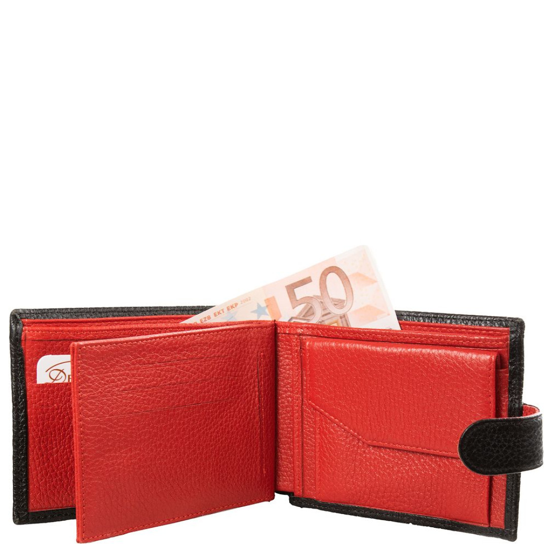 Особенности: включает в себя 2 отделения для бумажных купюр, монетницу на кнопке, а также 10 ячеек для карточек.  Внутри имеется 2 прозрачных окошка с сеткой и вшитый отдел на молнии.