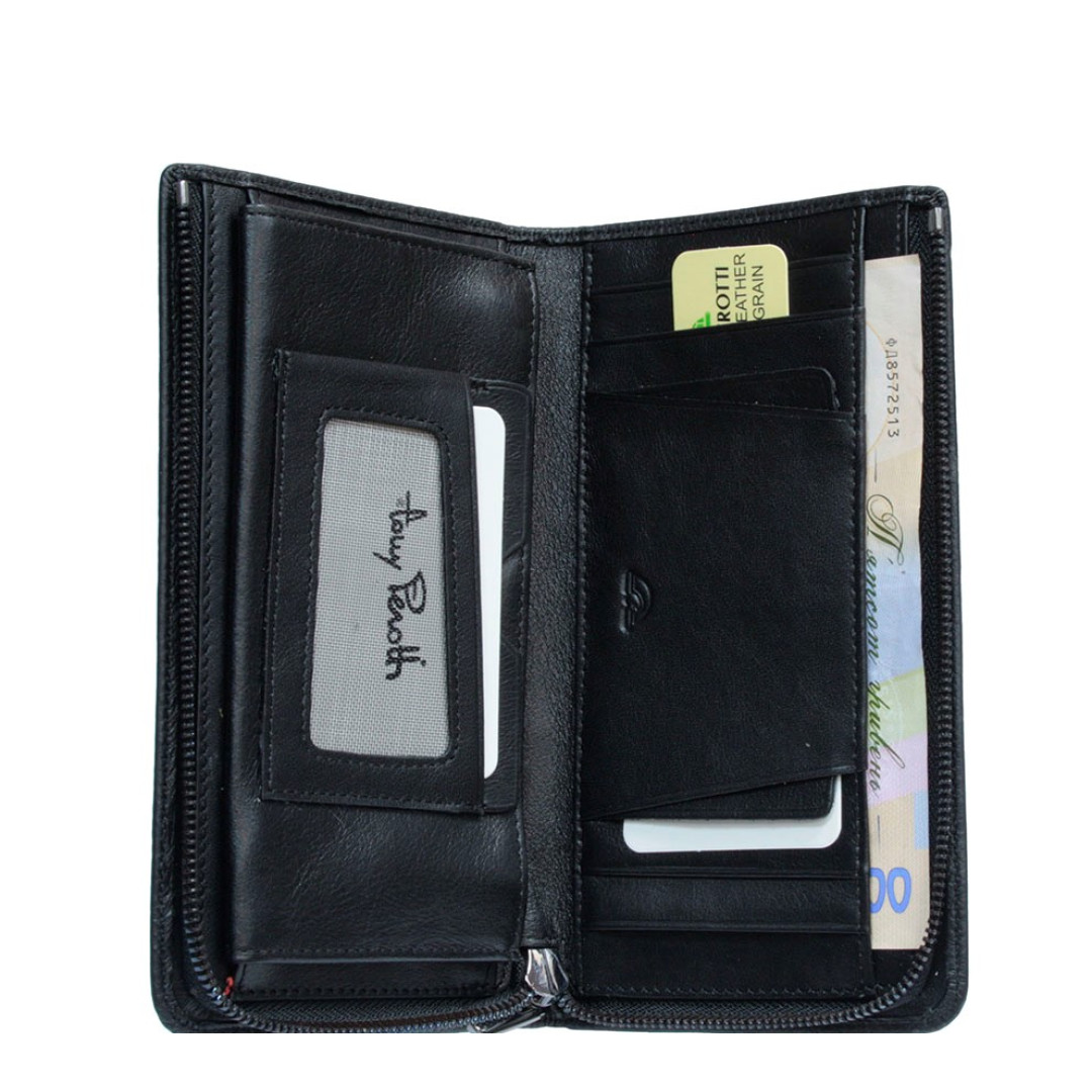 Особенности: с двух сторон закрывается на молнию. С одной стороны: 2 отделения для купюр разделены монетницей на молнии, там же расположены 3 кармашка для карточек, один из которых с полупрозрачной сеточкой для ID карточки или водительского удостоверения. С другой стороны дополнительное отделение для купюр+8 кармашков для карточек. С наружной стороны металлический шильдик с надписью tony Perotti, внутри шелковая подкладка, защитная голограмма и тиснение фирменная черепашка