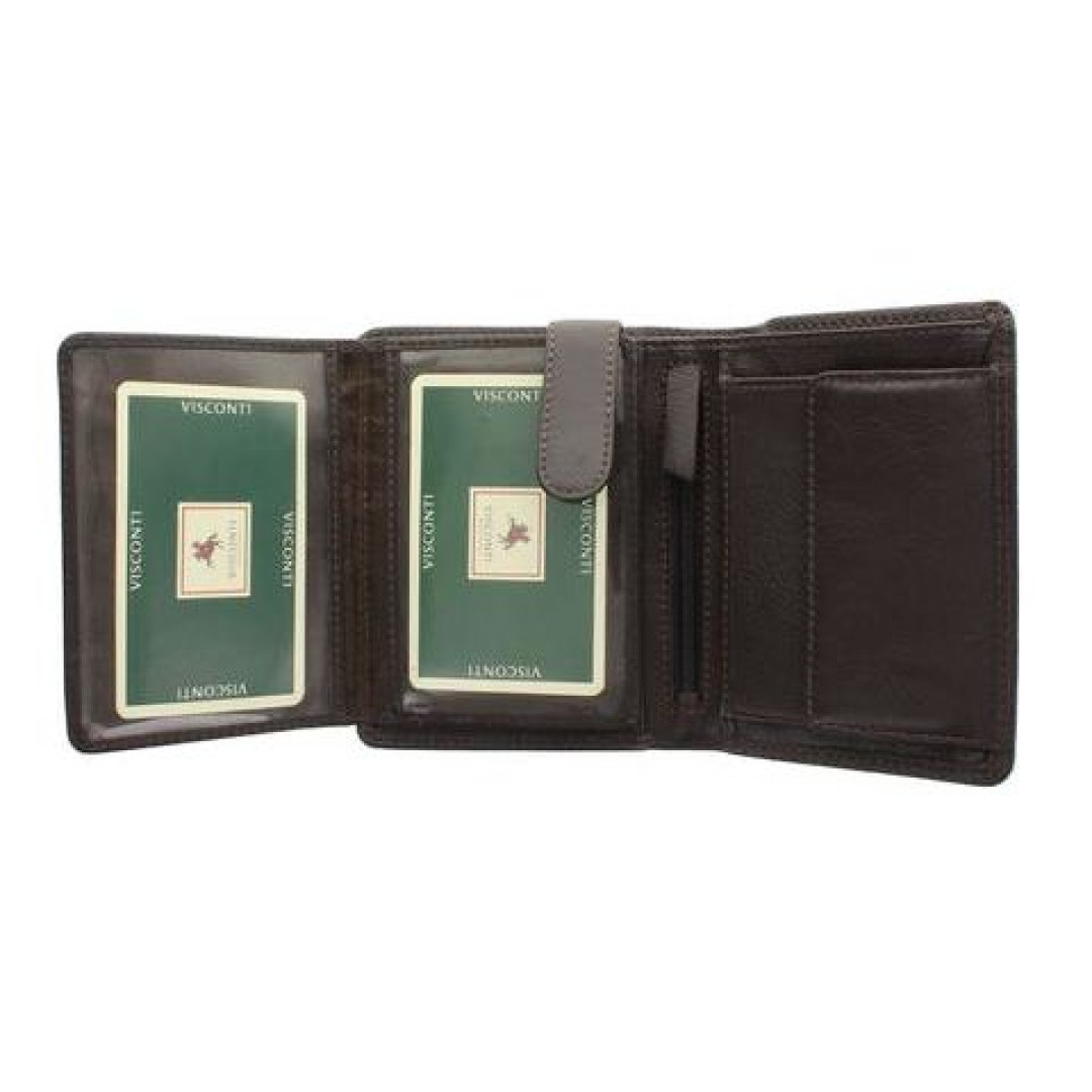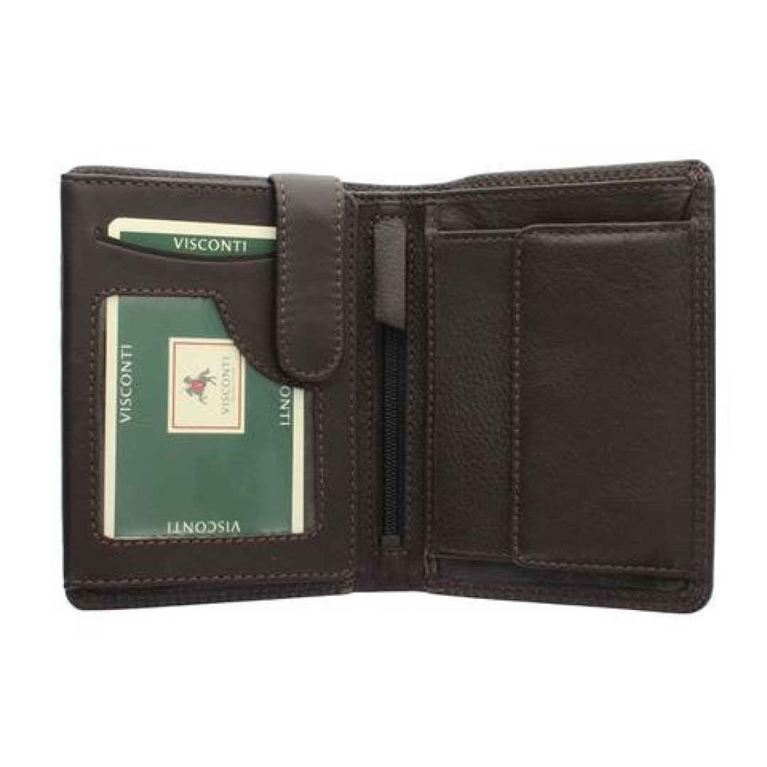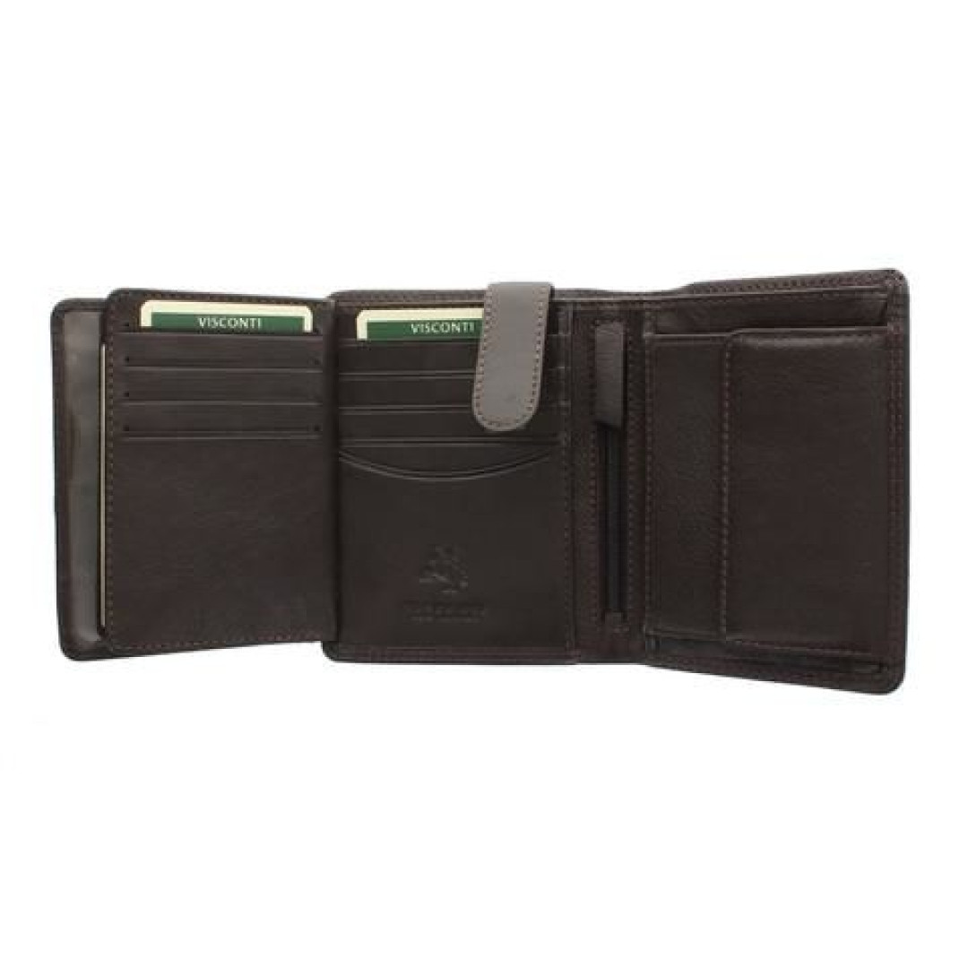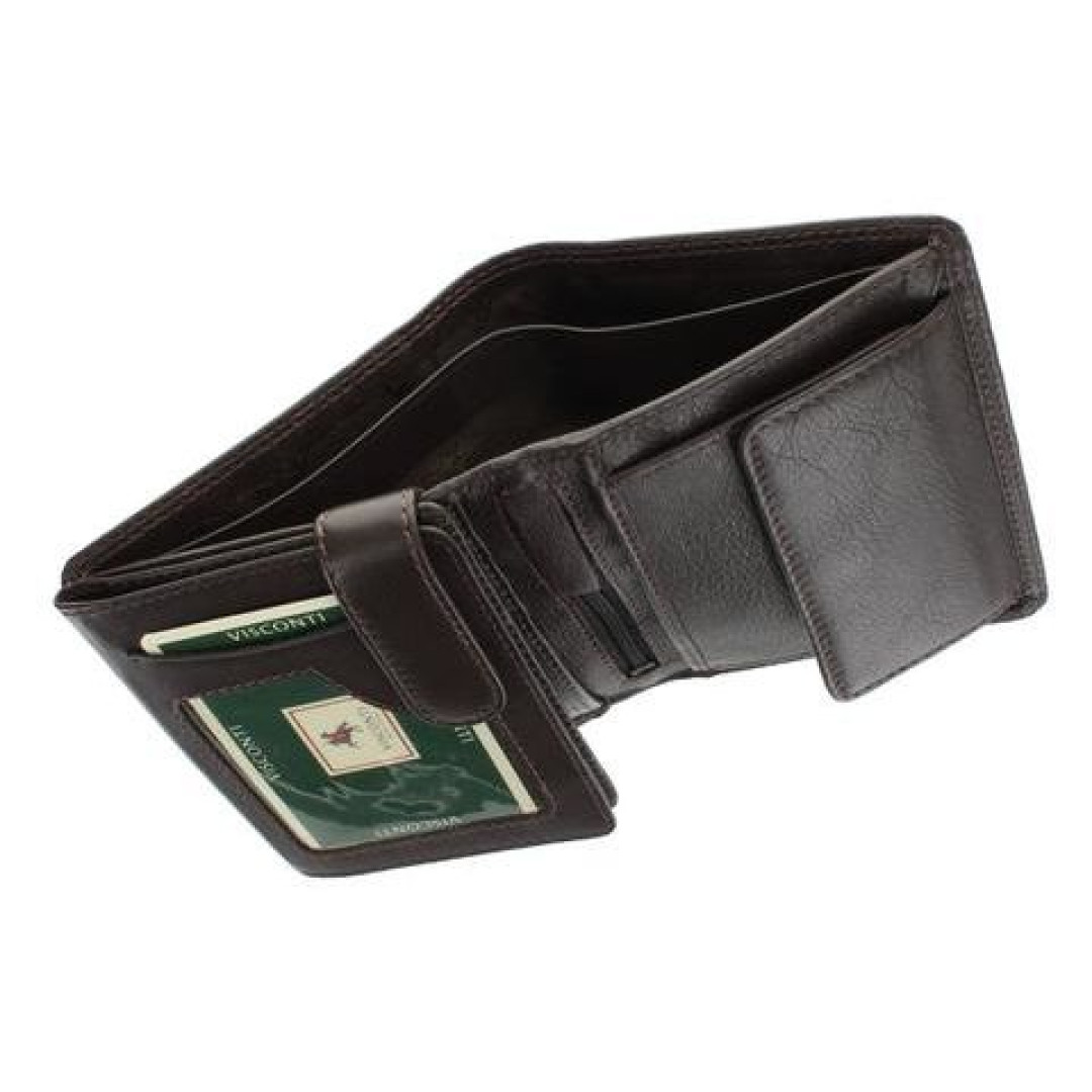 Внутри: Два отдела для купюр с тканевой подкладкой, брендированной логотипами "Visconti"; отдел для мелочи на кнопке; три прозрачных отдела для фотографии/прав/карточки; 9 отделов для карточек; один карман на молнии + два скрытых.