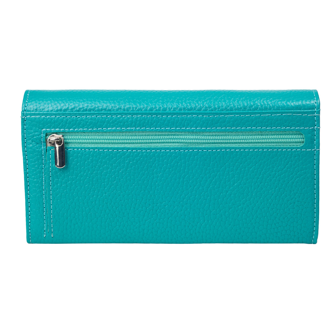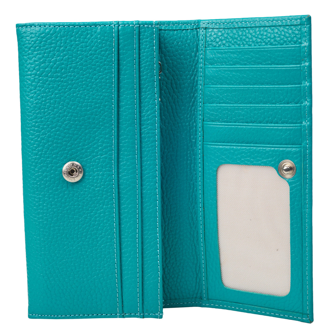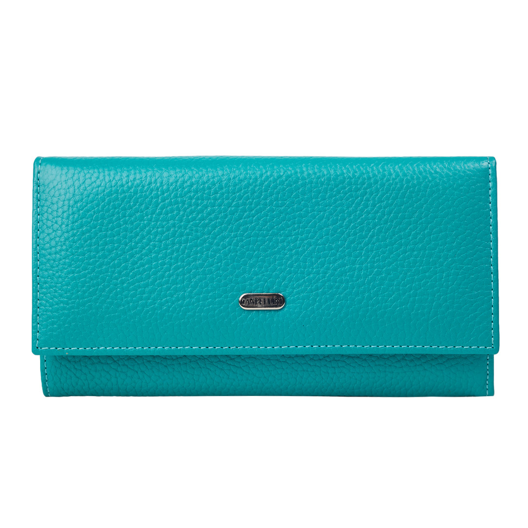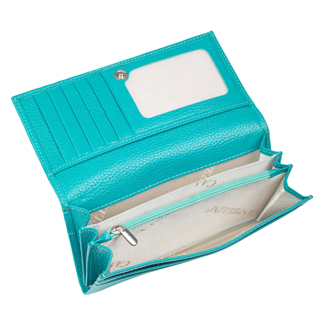 Женский кошелек Canpellini выполнен из натуральной кожи (флотар) в бирюзовом цвете.