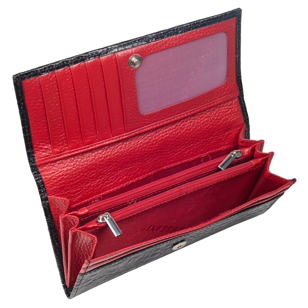 Особенности: внутри три отделения для купюр, два продольных кармана, три плоских кармана, шесть кармашков для карточек.