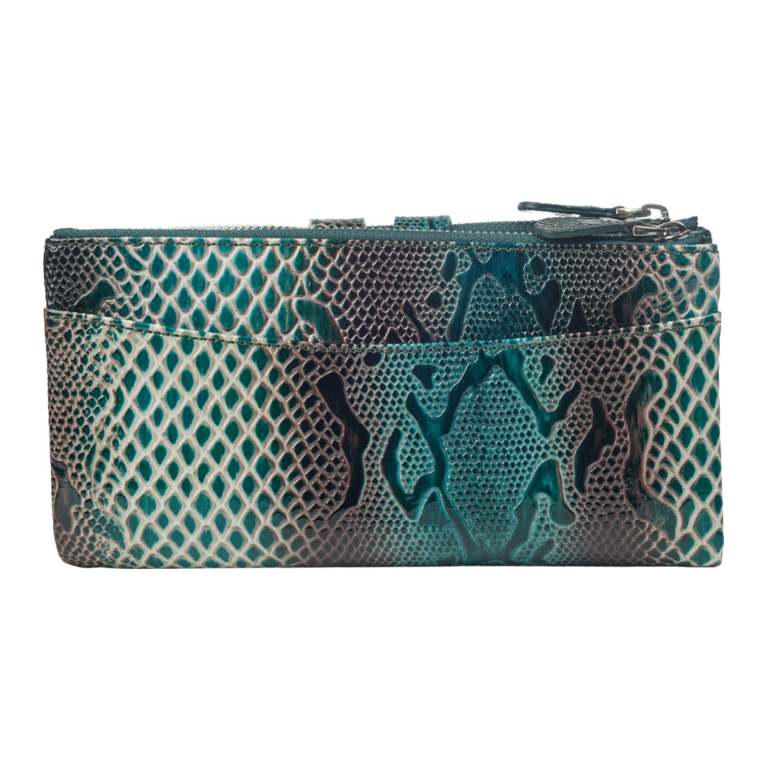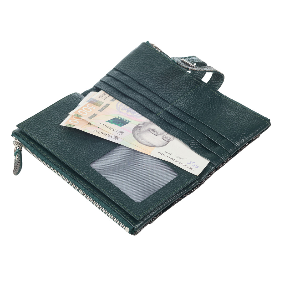 Особенности: модель закрывается на кнопку и имеет два основных отделения для купюр, две монетницы на молнии и целых 24 выемки для карт.