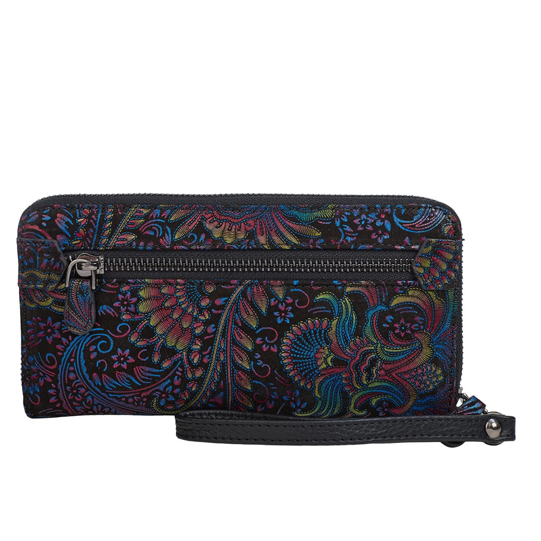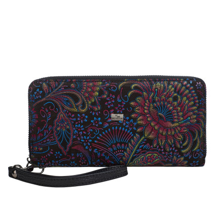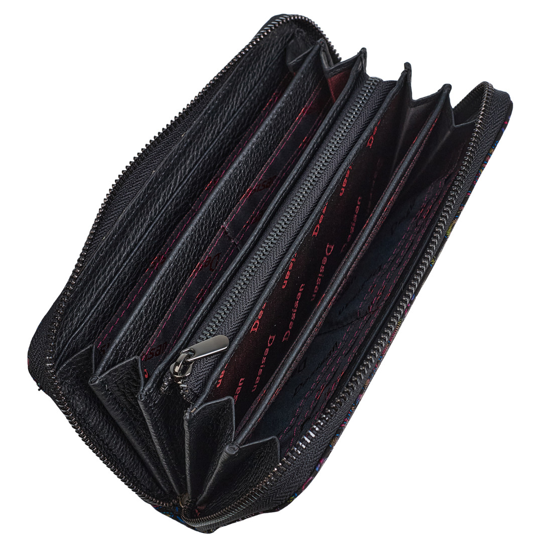Особенности: имеет четыре основных отсека для банкнот, пятнадцать ячеек  для карточек, кистевой ремешок и перегородку на молнии.