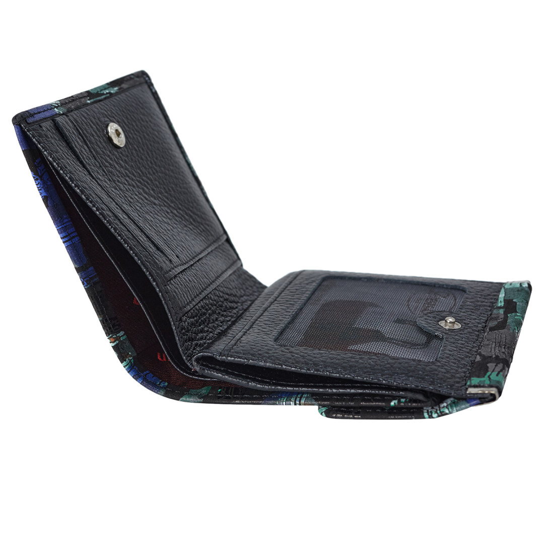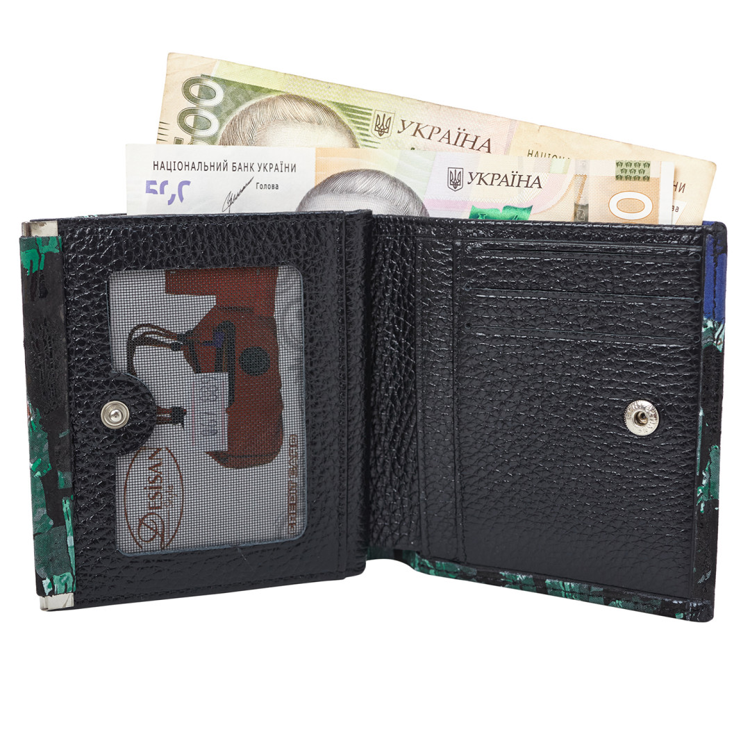 Особенности: закрывается на кнопку, имеет два отделения для купюр, прозрачный карман для фото и пять слотов для карт. На лицевой стороне отсек для монет на кнопке.