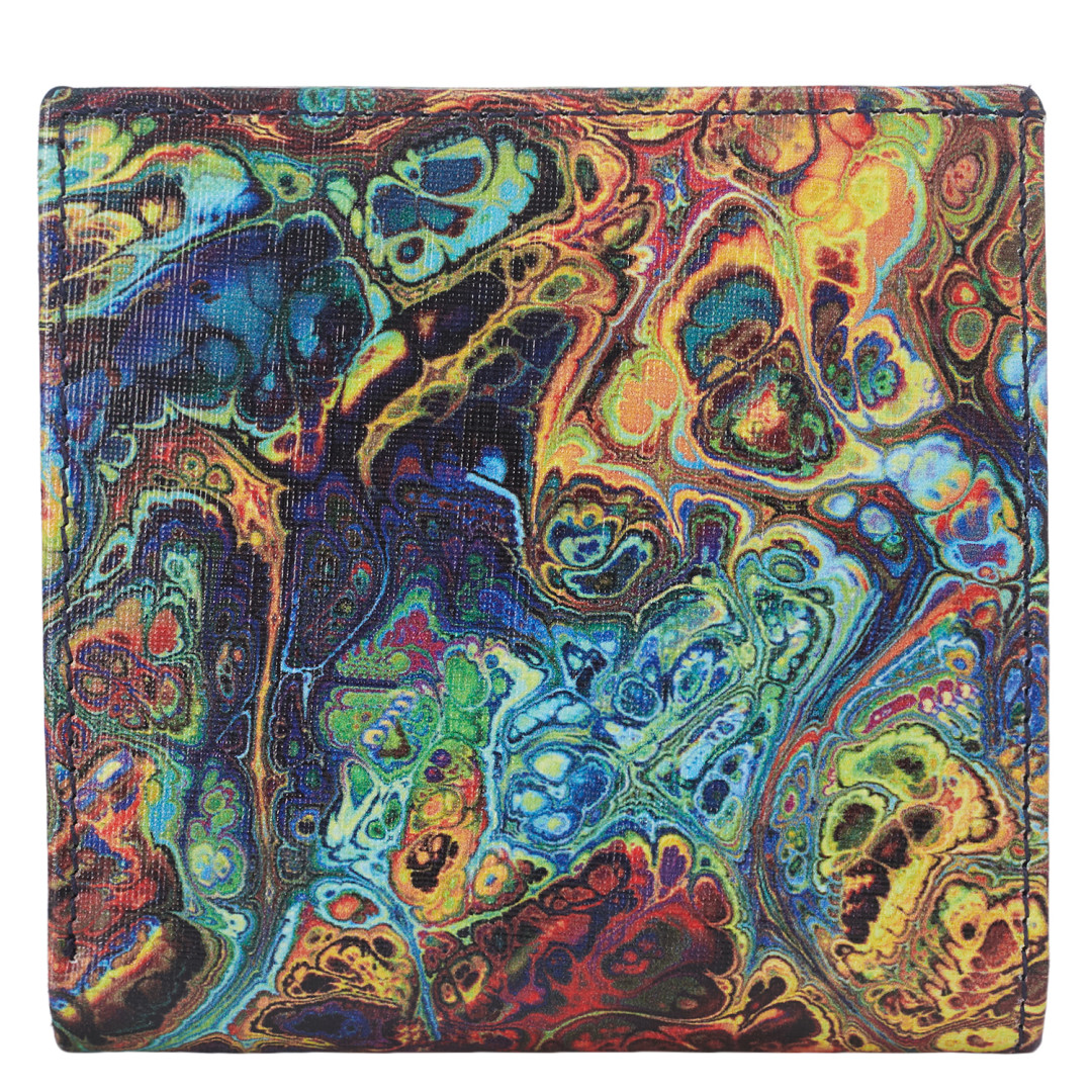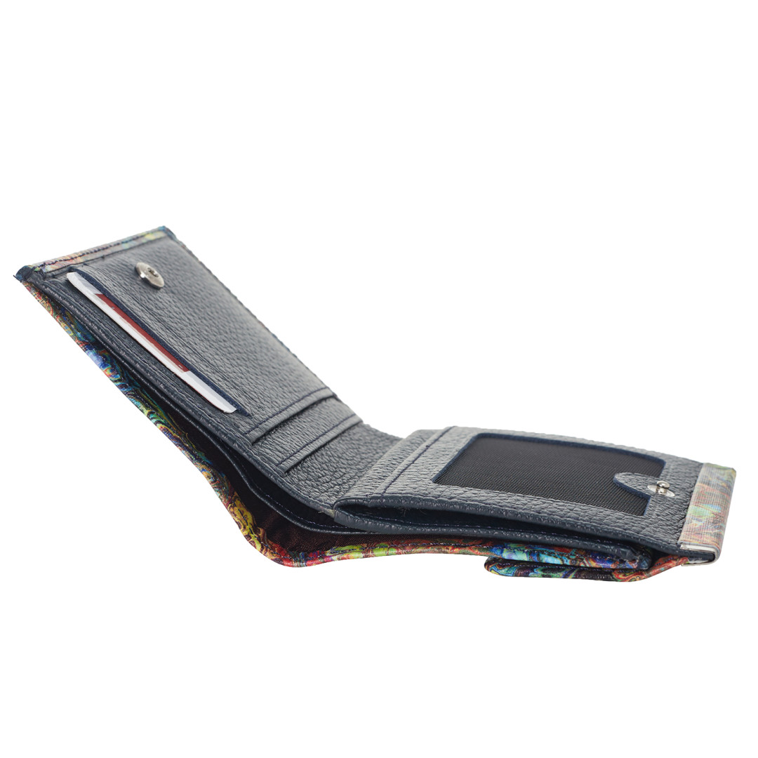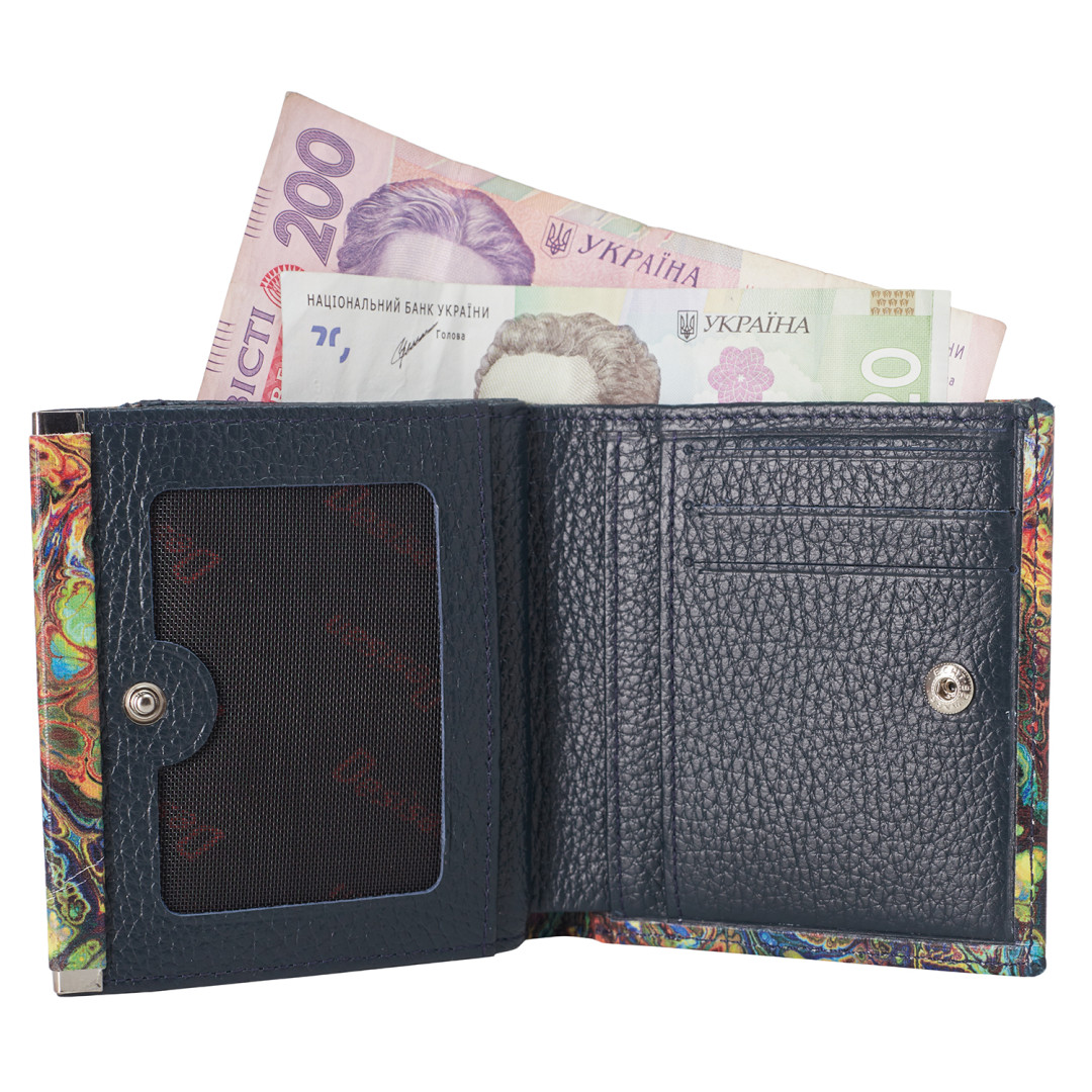 Особенности: закрывается на кнопку, имеет два отделения для купюр, прозрачный карман для фото и пять слотов для карт. На лицевой стороне отсек для монет на кнопке.