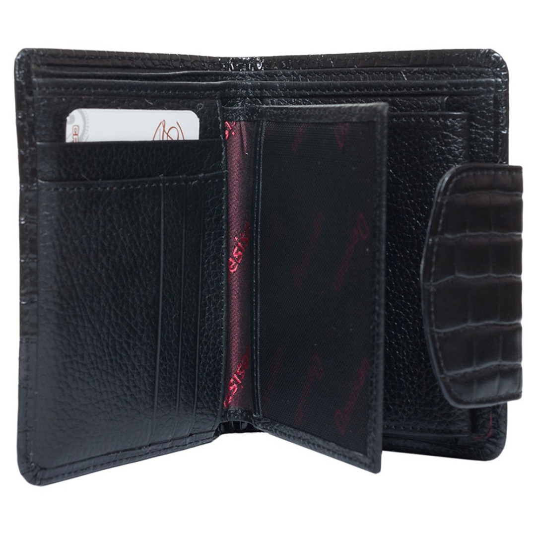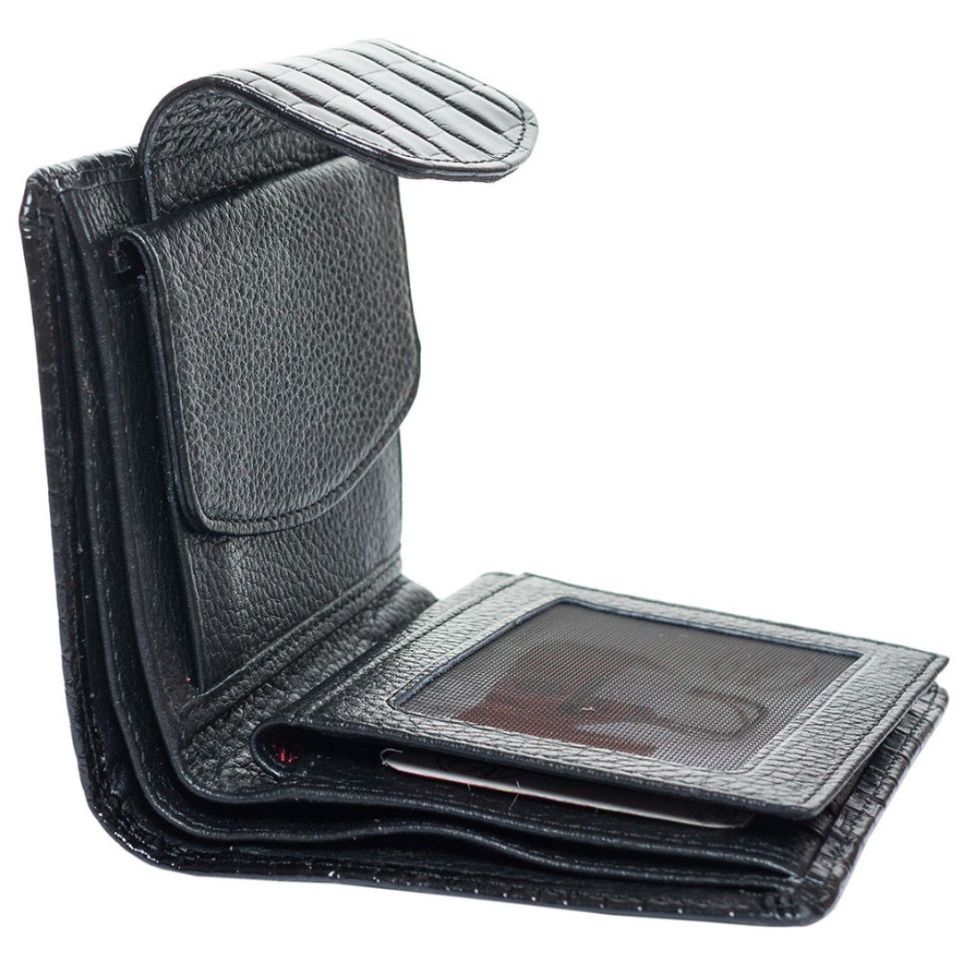 Особенности: имеет два отделения для купюр, монетницу на кнопке, два плоских кармана, пять отсеков для карточек.