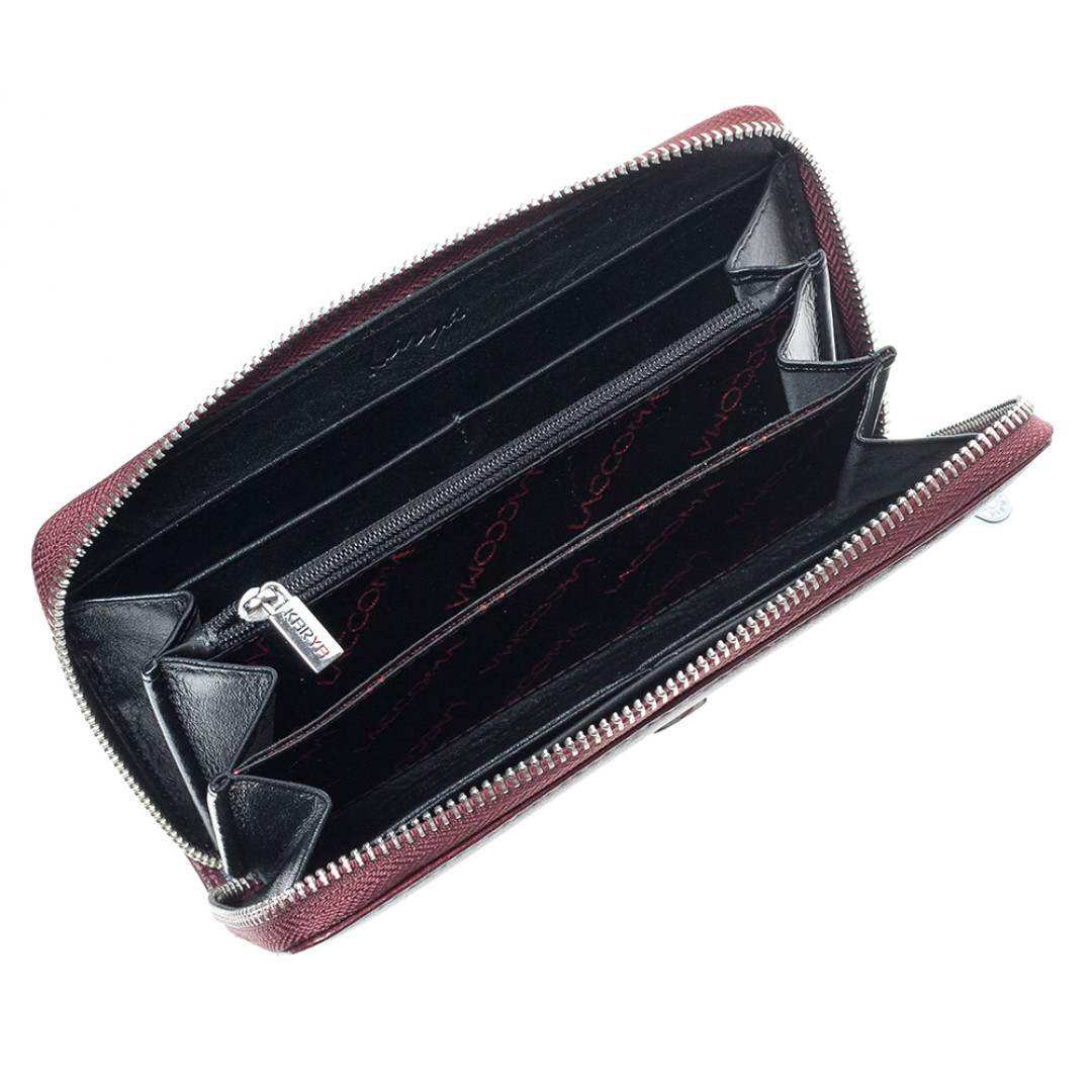 Особенности: 3 отделения для купюр, 8 кармашков для карточек, 2 кармана для документов, 2 кармашка для сим-карт, монетница на молнии. Кошелек застегивается на змейку.