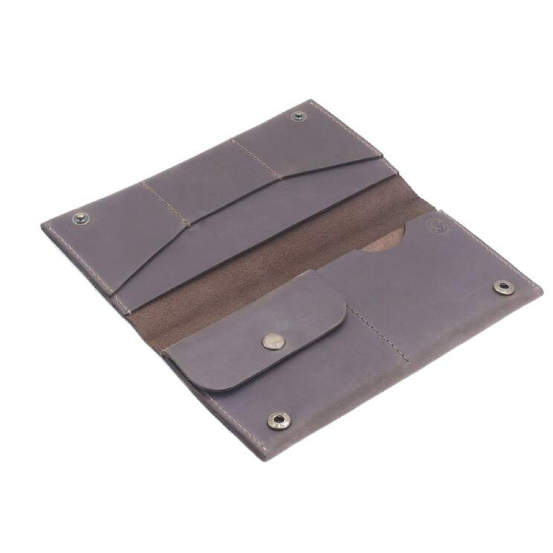 Имеет одно отделение на кнопке для мелочи, два больших отделения для купюр, четыре для кредитных карт и визиток. Закрывается на кнопки.