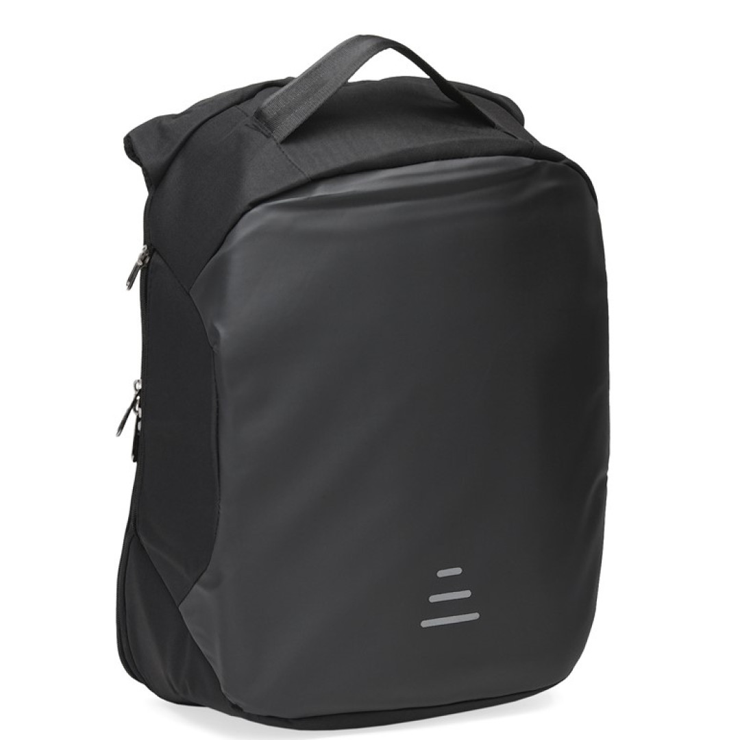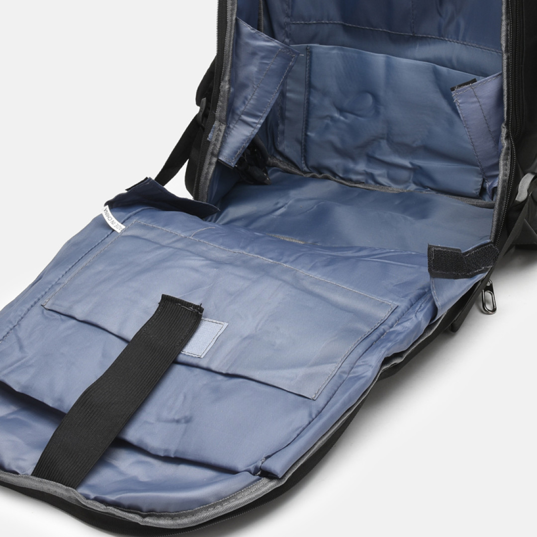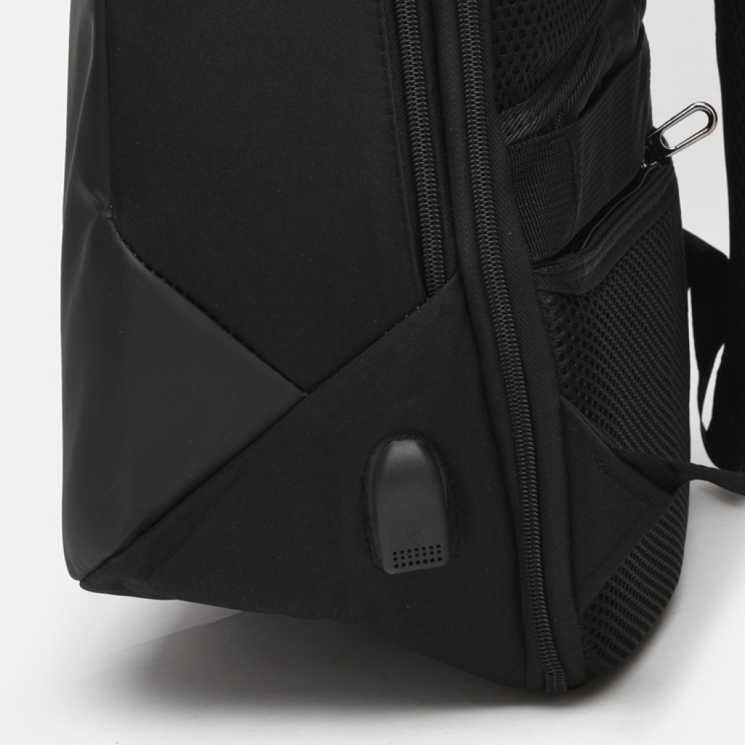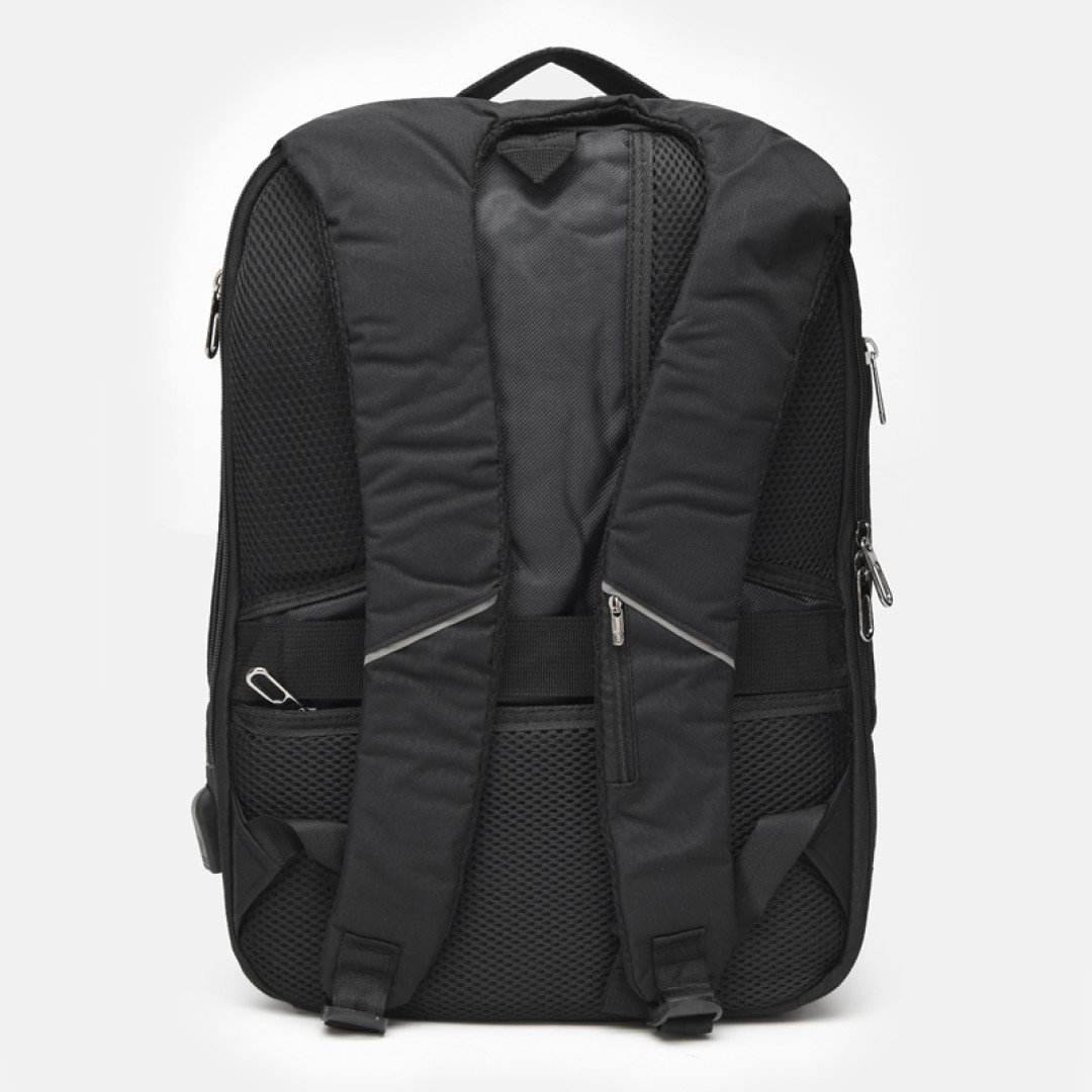 Особенности: имеет 1 основное отделение на молнии. Внутри отделение под ноутбук, 4 кармана, USB разъем. Снаружи - 1 карман на молнии и 2 боковых кармана на молнии. Подкладка -  текстиль. Лямки регулируются по длине.