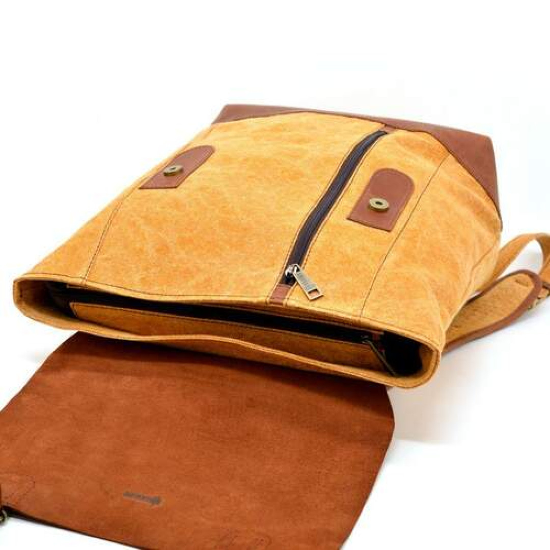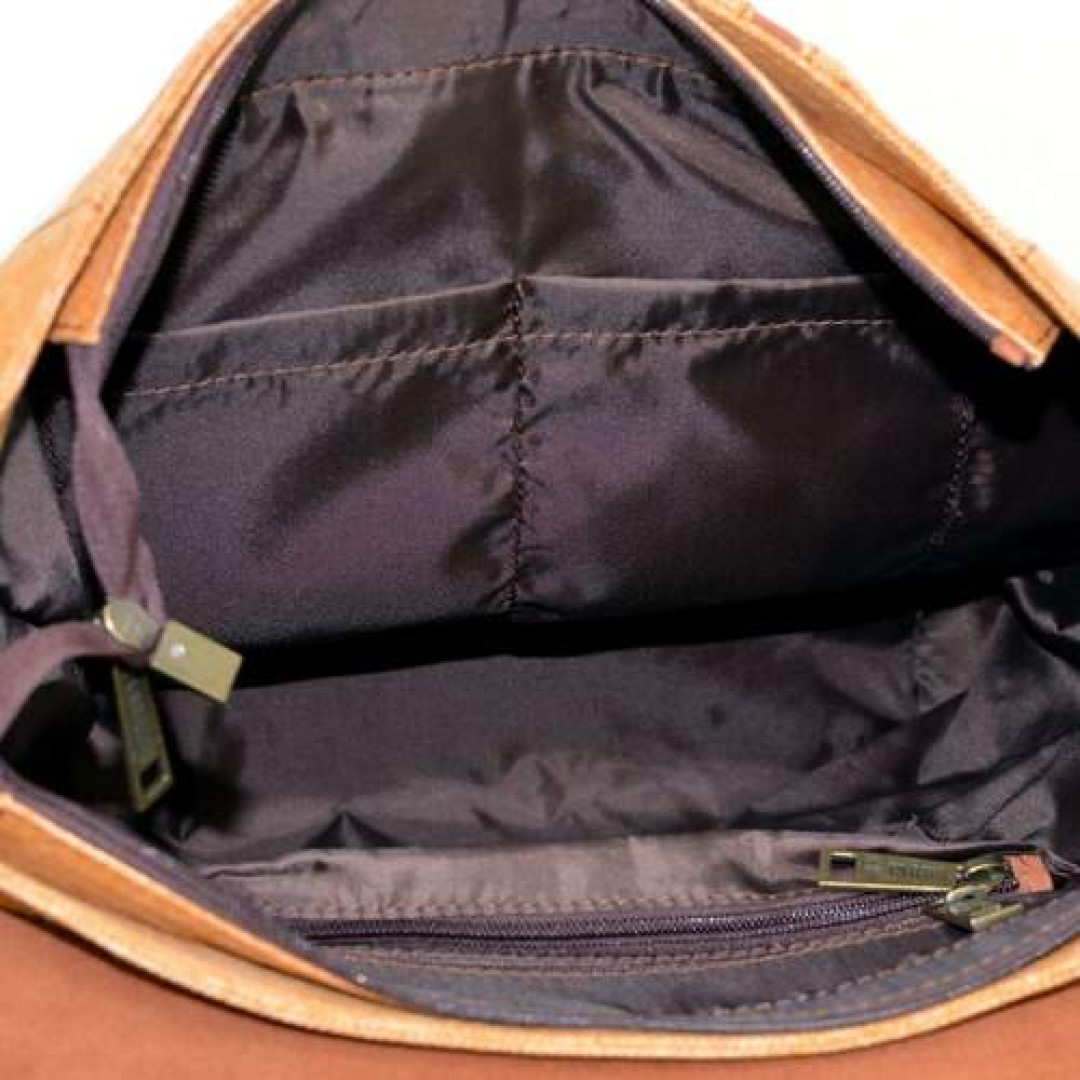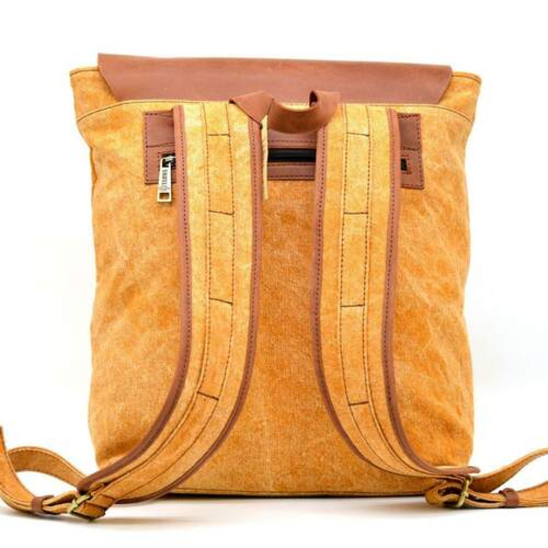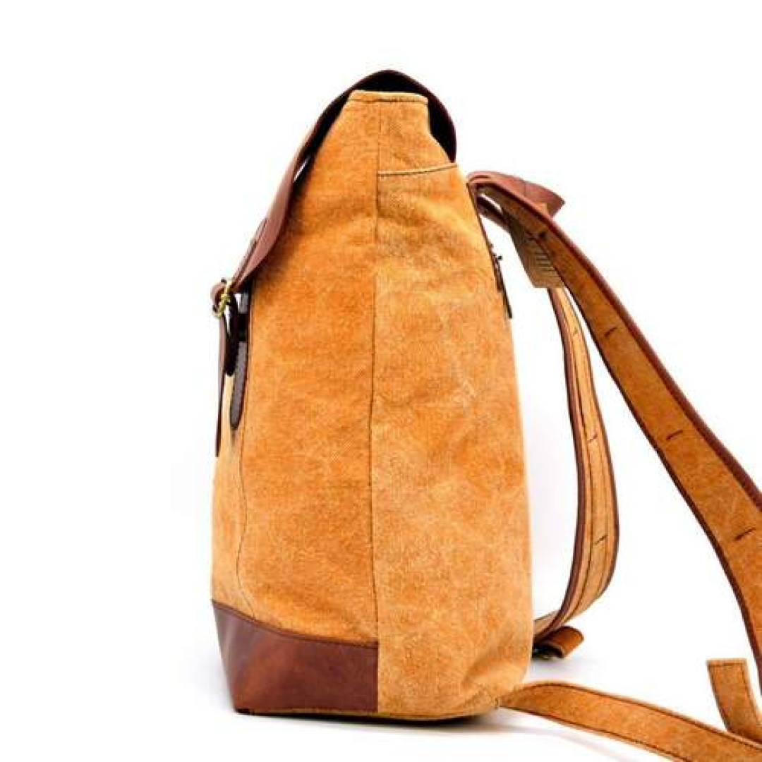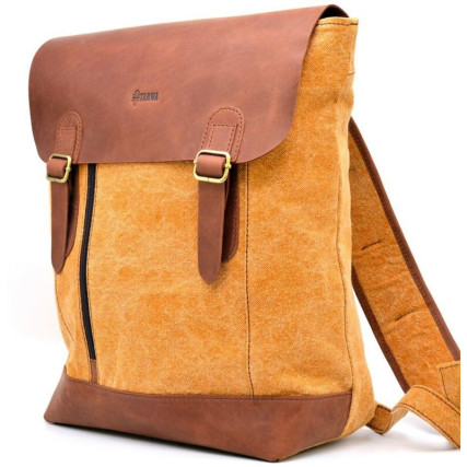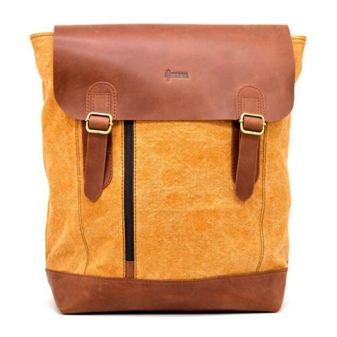 Изделие выполнено из очень плотной ткани канвас (парусина) с кожаными вставками, и клапаном из лошадиной кожи. Внутри рюкзак имеет одно большое отделение с тканевой подкладкой, внутри которого располагается карман-перегородка с молнией под разные гаджеты, и карман поменьше для мелких предметов, также с молнией, и два накладных кармана. На лицевой стороне аксессуара присутствует вертикальная молния-карман. Рюкзак застегивается на молнию и сверху накрывается клапаном, имеет широкие удобные шлейки.