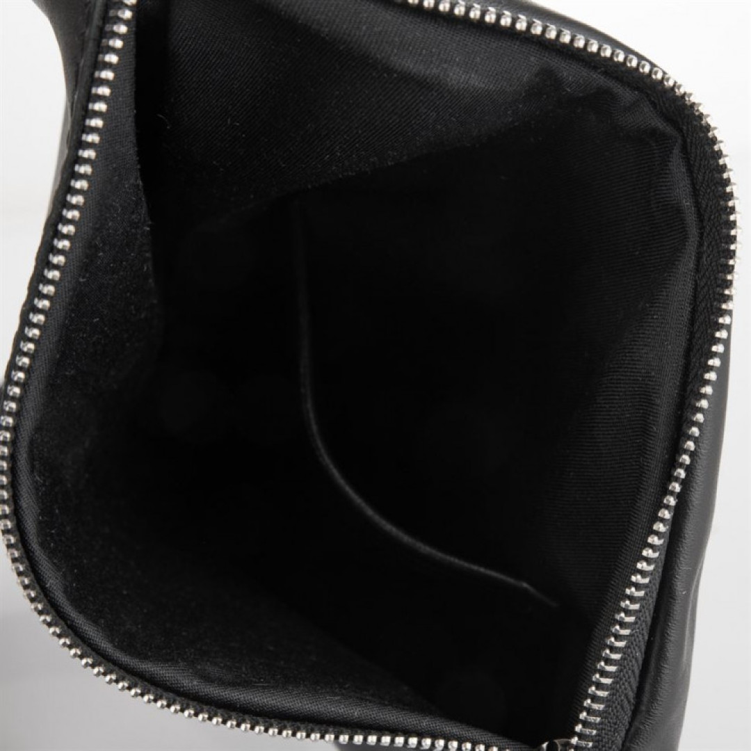Особенности: имеет одно вместительное отделение, застегивающееся на молнию. Лицевую сторону украшают два горизонтальных кармана с молниями, сверху - маленький карманчик с магнитной кнопкой. Моно-шлейка выполнена из кожи с текстильной основой, металлическая фурнитура.