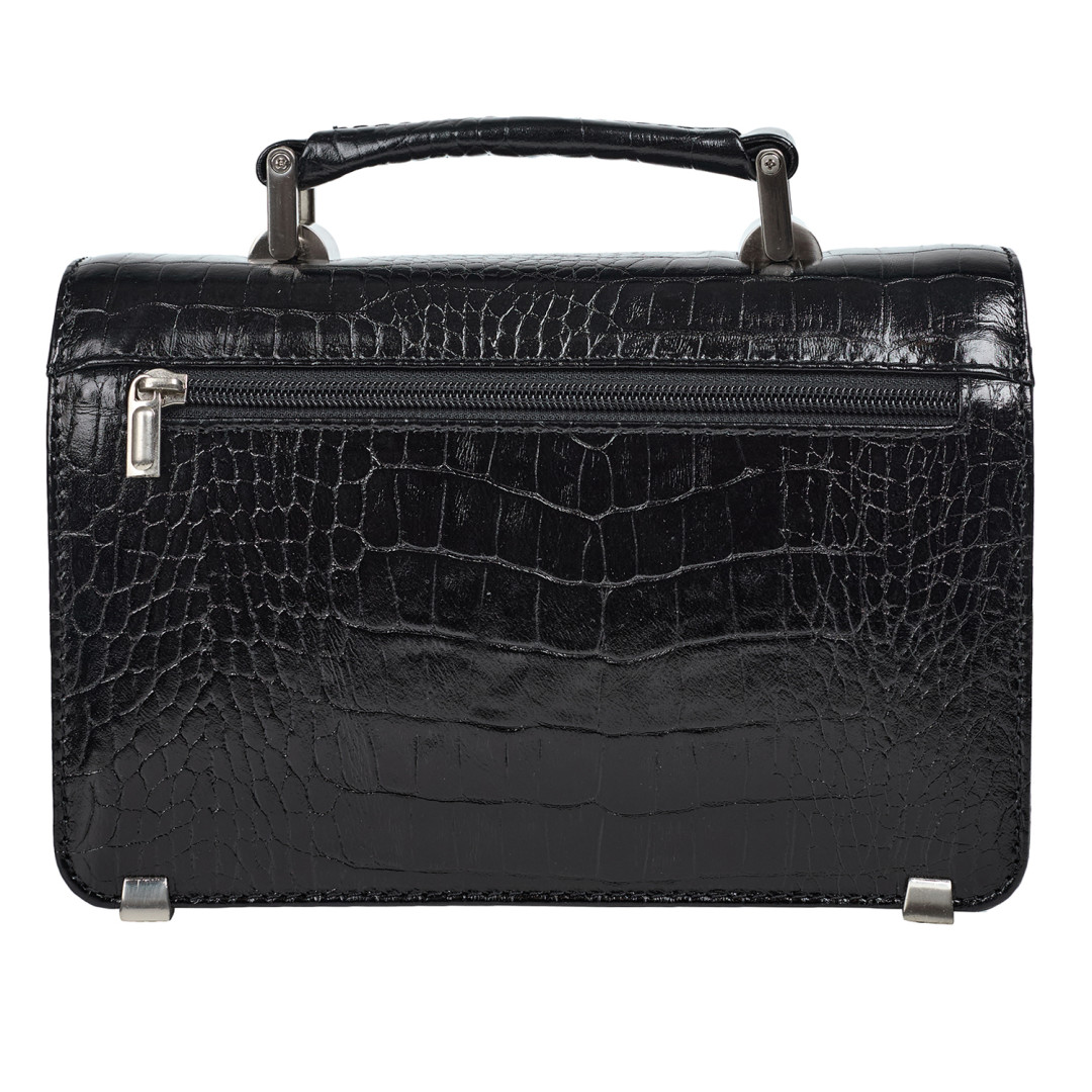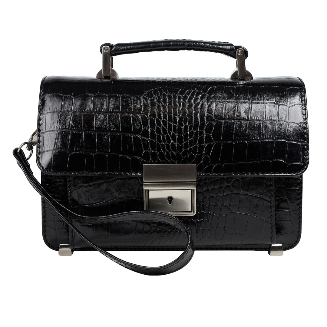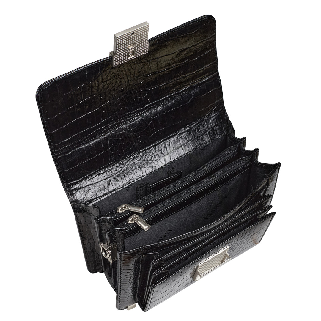 Мужская барсетка Canpellini выполнена из натуральной кожи под крокодила в черном цвете.