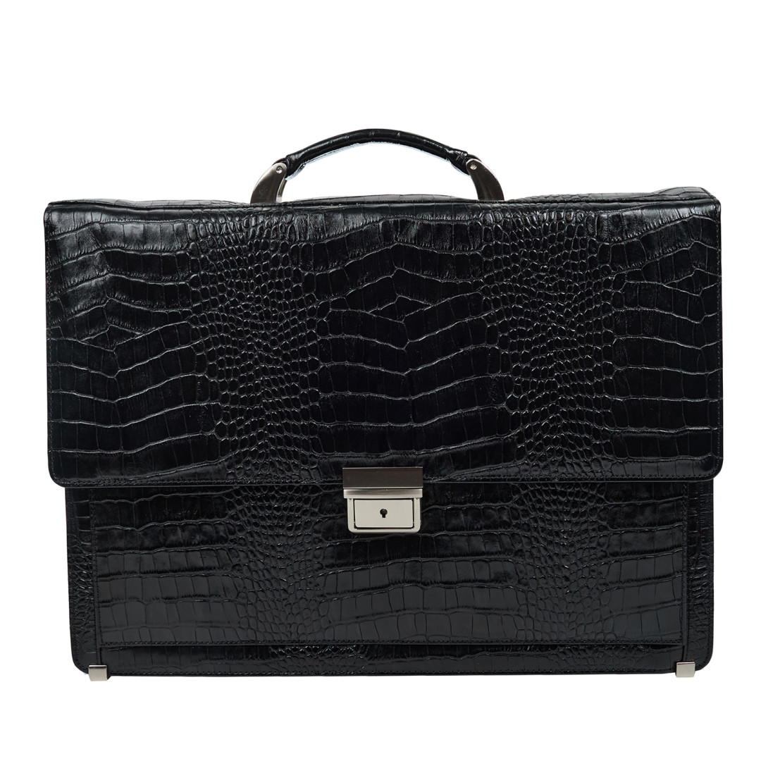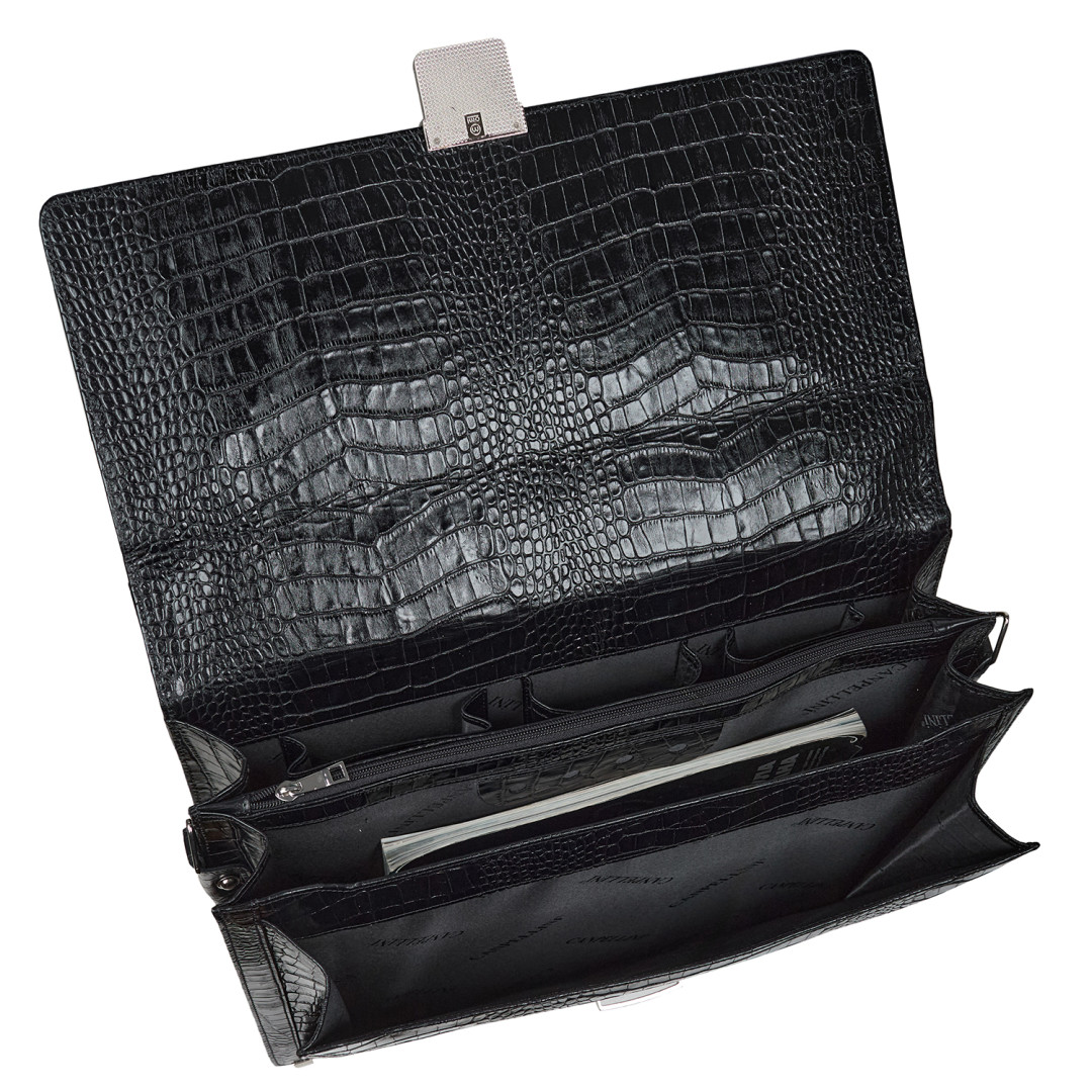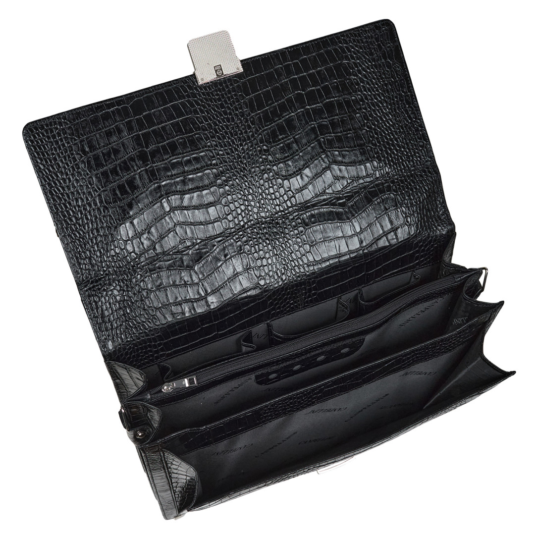 Мужской деловой портфель Canpellini выполнен из натуральной кожи под крокодила в черном цвете.