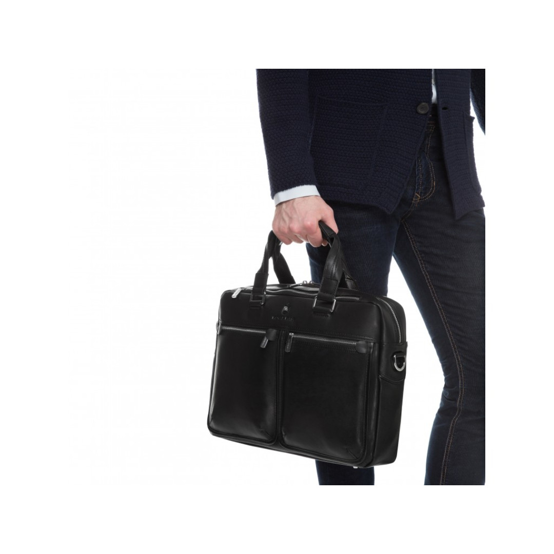 Особенности: основное отделение закрывается на молнию и содержит отсек для ноутбука с фиксатором. Подкладка из плотного текстиля черного цвета. С лицевой стороны аксессуара расположены два кармана, с тыльной стороны один дополнительный отсек горизонтального формата на молнии. Два варианта носки - в руках или на плече. Съемный наплечный ремень идет в комплекте, крепится на карабины и регулируется по высоте. На дне сумки пять металлических кнопок, которые защищают кожу от механических повреждений поверхности.