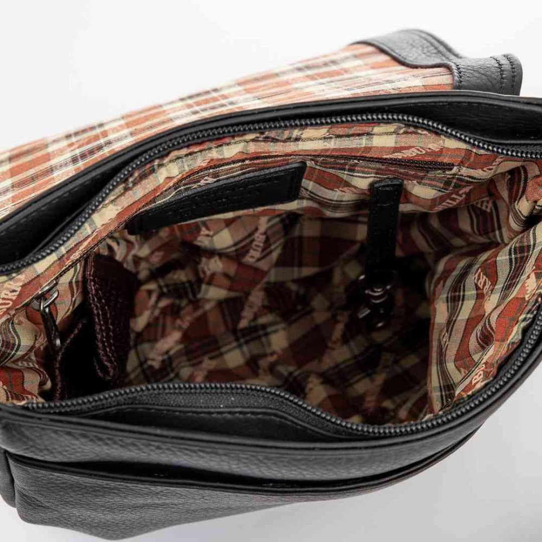 Особенности: имеет одно основное отделение на молнии, органайзеры для мелкой канцелярии. С лицевой стороны под клапаном карман, с тыльной стороны - карман на змейке. Клапан на магнитной копке. Подкладка - текстиль. Несъемный плечевой ремень регулируется по длине.