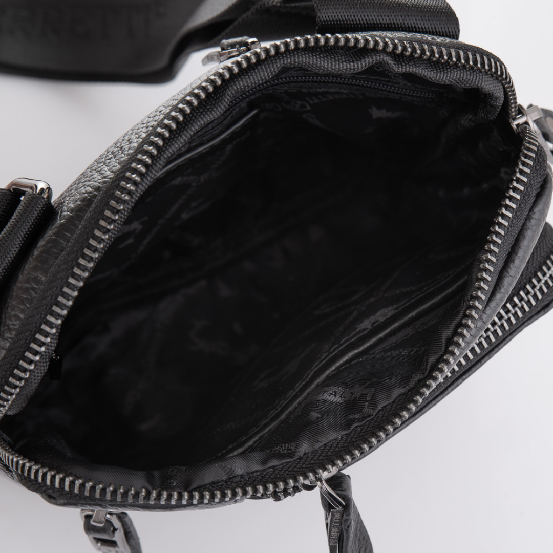 Особенности: имеет одно основное отделение, внутри органайзеры для мелкой канцелярии. С лицевой стороны два кармана на молнии, с тыльной - вертикальный карман на змейке. Подкладка - текстиль. Несъемный плечевой ремень регулируется по длине.