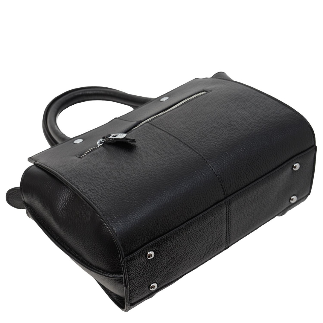 Особенности: внутри одно основное отделение с перегородкой в виде кармана на молнии, боковой карман горизонтального типа на змейке, два отсека открытого типа. С лицевой и тыльной стороны карман на молнии. В комплекте съёмный плечевой ремень. Подкладка - текстиль. Фурнитура - металл, металлические ножки.