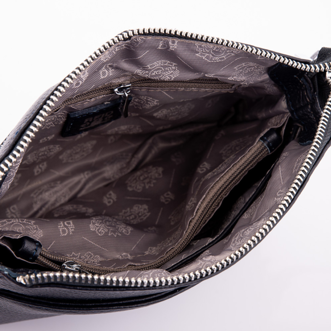 Особенности: имеет одно основное отделение, с перегородкой в виде кармана на молнии, внутри несколько карманов открытого и закрытого типа. С лицевой стороны - карман на кнопке, с тыльной - отсек на змейке . Подкладка - текстиль. Фурнитура - металл. Съемный ремешок для носки на плече регулируется по длине.