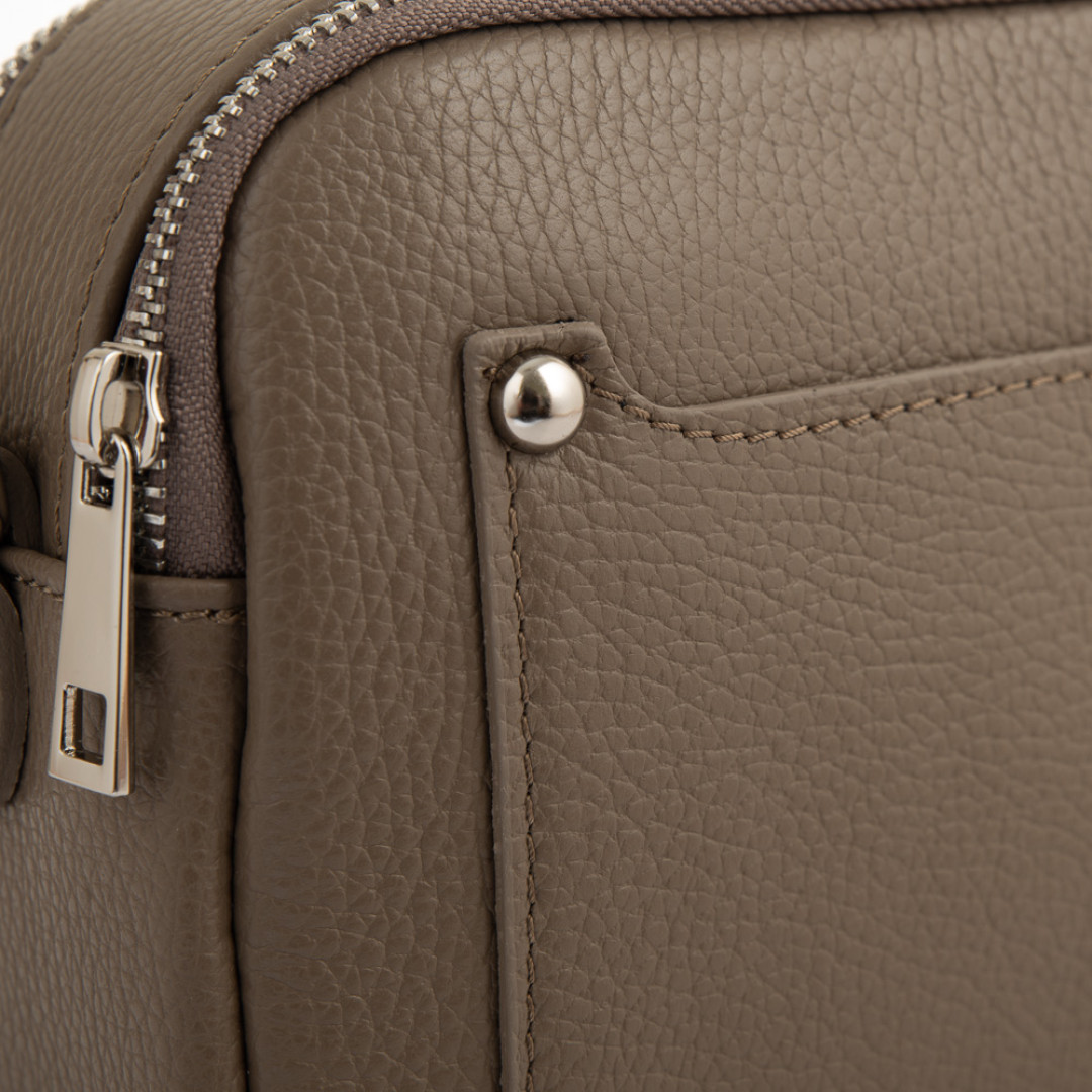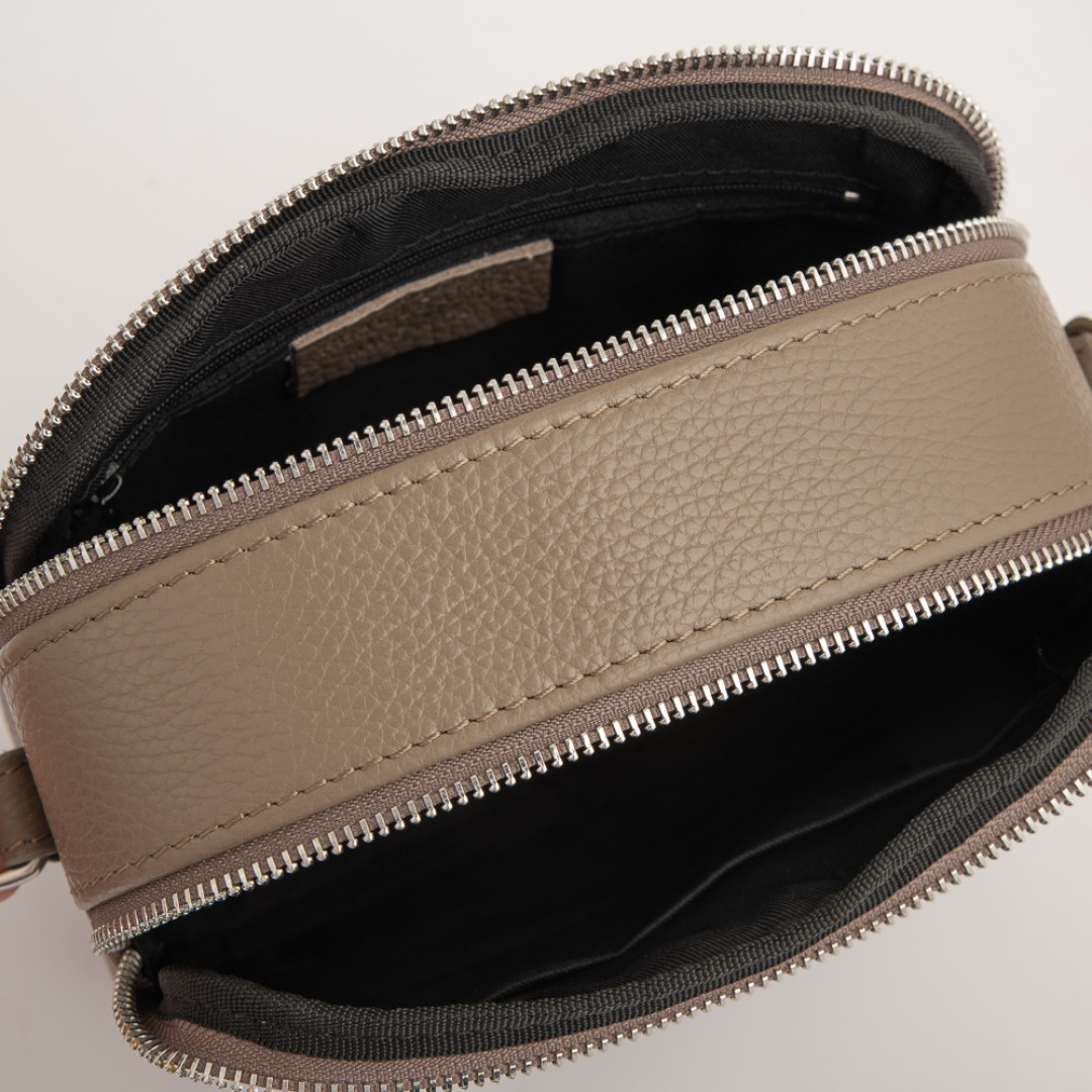 Особенности: имеет два отделения на молнии, внутри два боковых кармана горизонтального типа. Подкладка - текстиль. Фурнитура - металл. В комплекте съёмный ремешок для носки на плече.